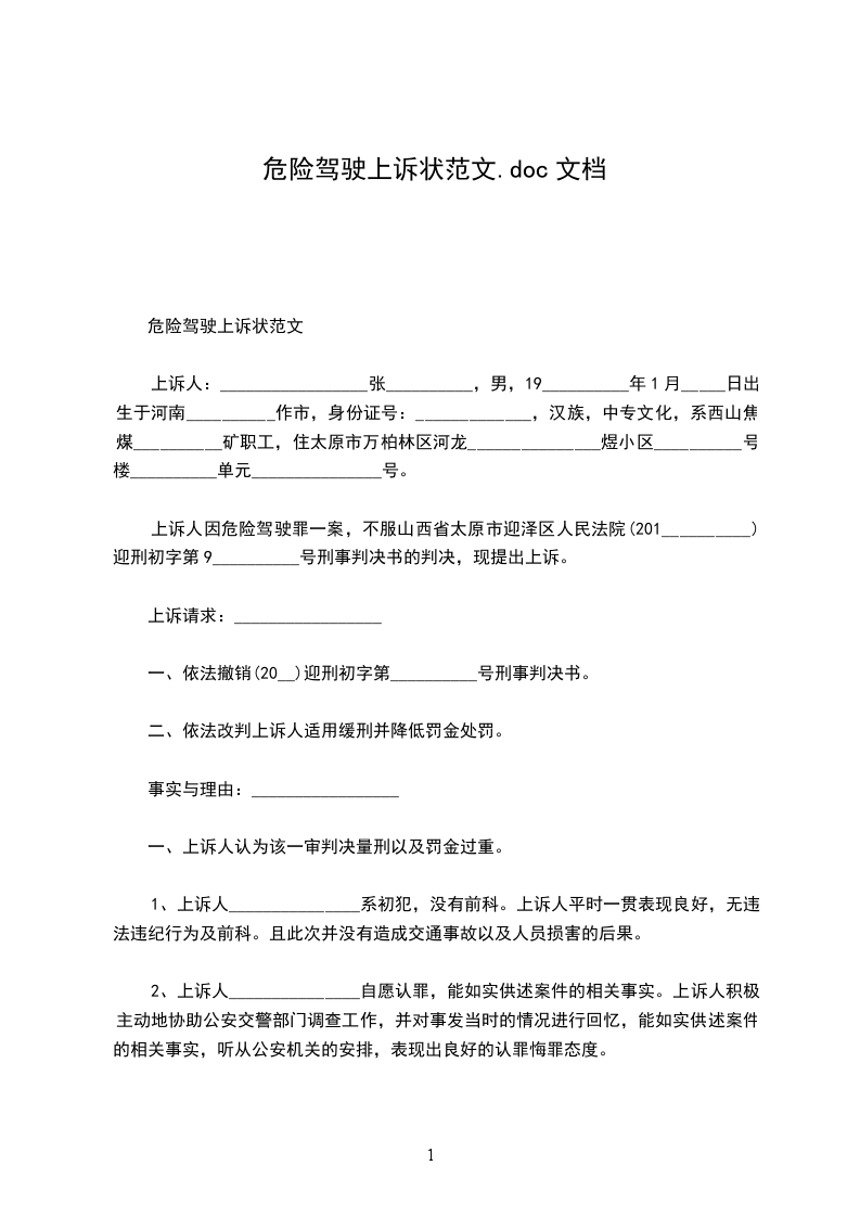 上诉人:_________________张__________,男,19__________年1月_____日出生于河南__________作市,身份证号:_____________,汉族,中专文化,系西山焦煤__________矿职工,住太原市万柏林区河龙_______________煜小区__________号楼__________单元_______________号。