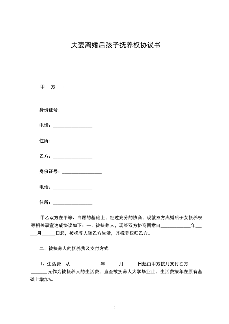 二、儿子_______由_______抚养,由_______每月给付抚养费_______元,在每月10号前付清;直至付到18周岁止,18周岁之后的有关费用双方日后重新协商。