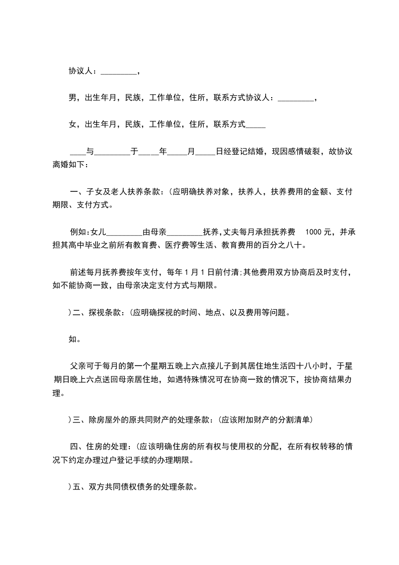 协议人双方于_______年_______月_______日登记结婚,_______年_______月_______日生育一子,取名_______。现协议双方夫妻感情已完全破裂,经双方协商一致,就自愿离婚、财产分割及子女抚养事宜达成如下协议: