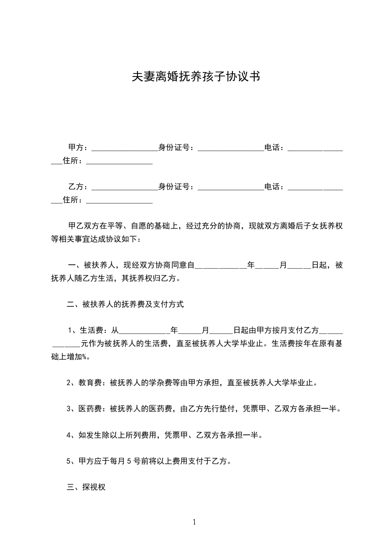 五、_______可在(时间)接儿子到其居住地,于(时间)送回_______居住地;如临时探望,可提前天与_______协商,达成一致后可按协商的办法进行探望。本协议一式叁份,双方各执一份,婚姻登记机关存档一份,在双方签字,并经婚姻登记机关办理相应手续后生效。