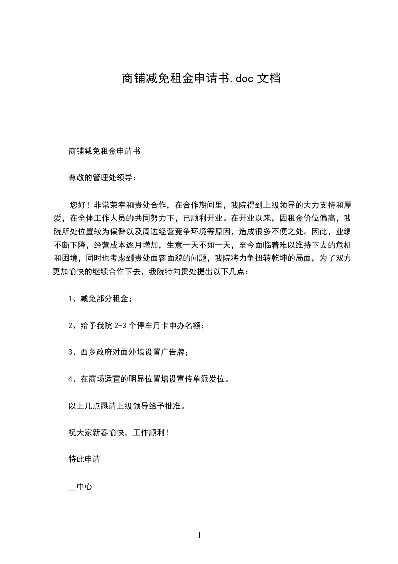 商铺减免租金申请书