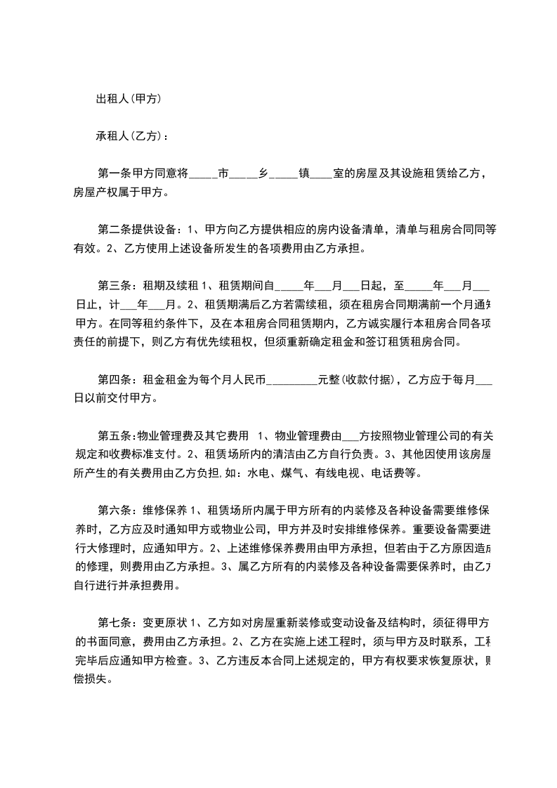 第一条甲方同意将_____市_____乡_____镇____室的房屋及其设施租赁给乙方,房屋产权属于甲方。