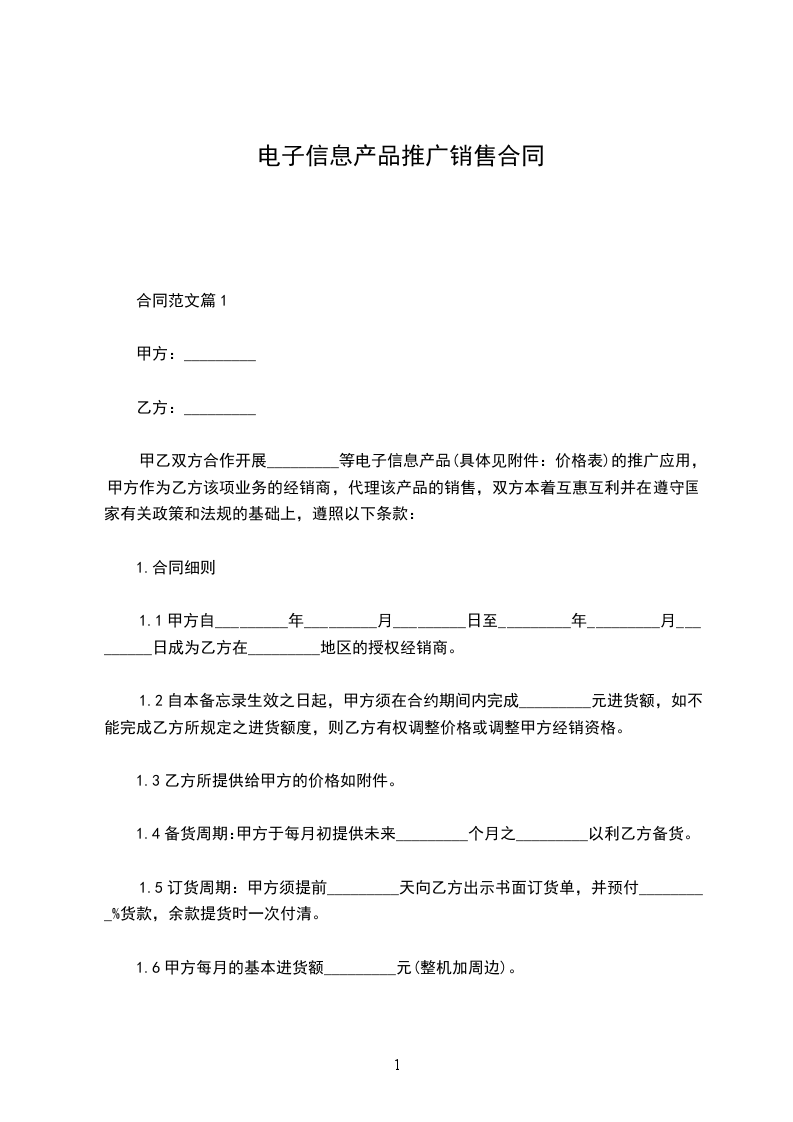 甲乙双方合作开展_________等电子信息产品的推广应用,甲方作为乙方该项业务的经销商,代理该产品的销售,双方本着互惠互利并在遵守国家有关政策和法规的基础上,遵照以下条款: