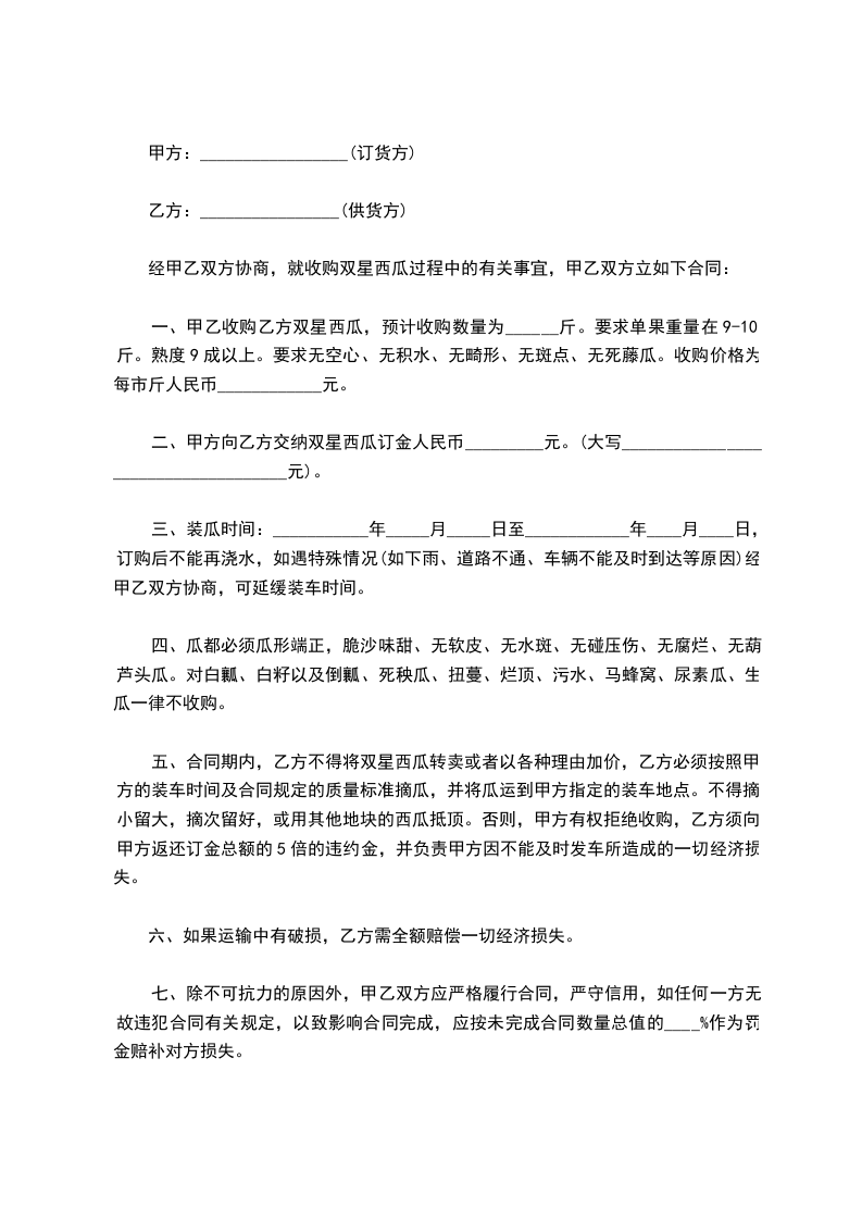 一、甲乙收购乙方双星西瓜,预计收购数量为______斤。要求单果重量在9-10斤。熟度9成以上。要求无空心、无积水、无畸形、无斑点、无死藤瓜。收购价格为每市斤人民币____________元。