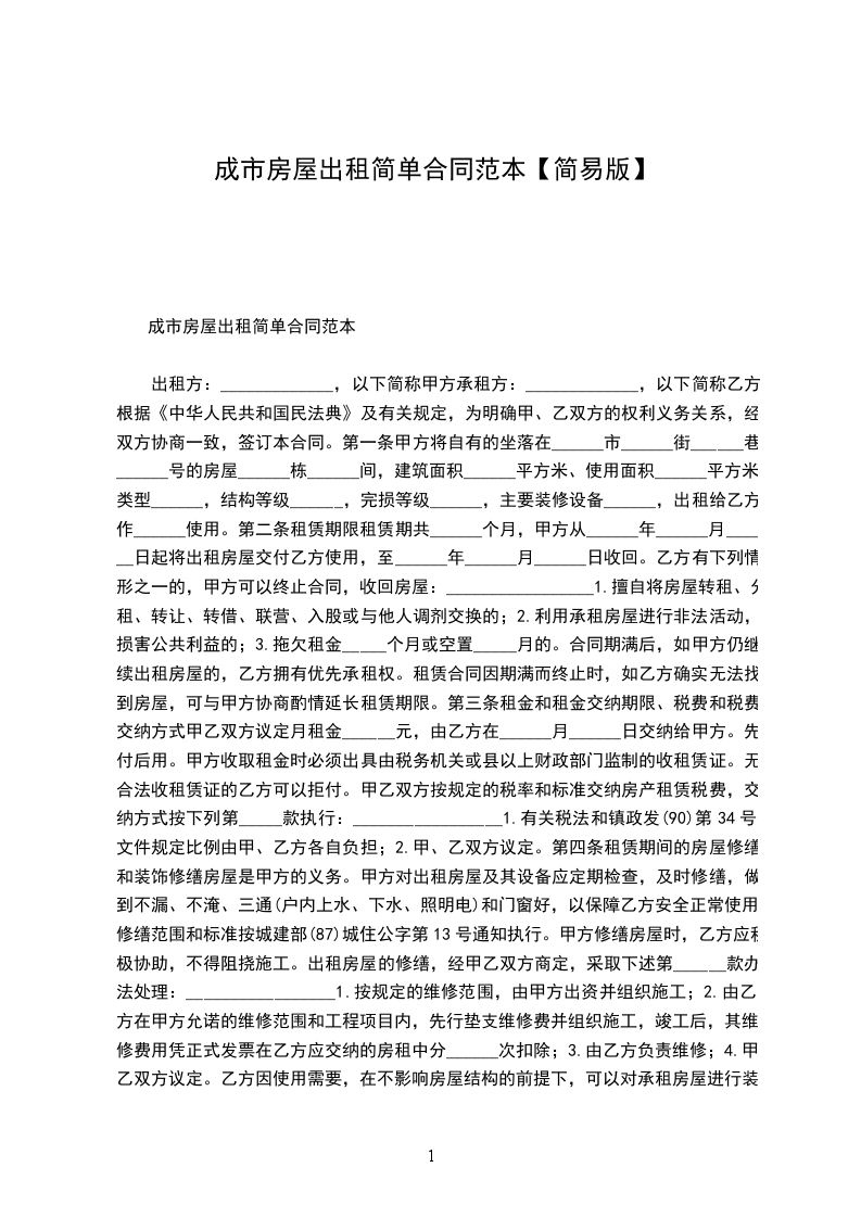 出租方:_____________,以下简称甲方承租方:_____________,以下简称乙方根据《中华人民共和国民法典》及有关规定,为明确甲、乙双方的权利义务关系,经双方协商一致,签订本合同。第一条甲方将自有的坐落在______市______街______巷______号的房屋______栋______间,建筑面积______平方米、使用面积______平方米,类型______,结构等级______,完损等级______,主要装修设备______,出租给乙方作______使用。第二条租赁期限租赁期共______个月,甲方从______年______月______日起将出租房屋交付乙方使用,至______年______月______日收回。乙方有下列情形之一的,甲方可以终止合同,收回房屋:_________________1.擅自将房屋转租、分租、转让、转借、联营、入股或与他人调剂交换的;2.利用承租房屋进行非法活动,损害公共利益的;3.拖欠租金_____个月或空置_____月的。合同期满后,如甲方仍继续出租房屋的,乙方拥有优先承租权。租赁合同因期满而终止时,如乙方确实无法找到房屋,可与甲方协商酌情延长租赁期限。第三条租金和租金交纳期限、税费和税费交纳方式甲乙双方议定月租金______元,由乙方在______月______日交纳给甲方。先付后用。甲方收取租金时必须出具由税务机关或县以上财政部门监制的收租赁证。无合法收租赁证的乙方可以拒付。甲乙双方按规定的税率和标准交纳房产租赁税费,交纳方式按下列第_____款执行:_________________1.有关税法和镇政发(90)第34号文件规定比例由甲、乙方各自负担;2.甲、乙双方议定。第四条租赁期间的房屋修缮和装饰修缮房屋是甲方的义务。甲方对出租房屋及其设备应定期检查,及时修缮,做到不漏、不淹、三通(户内上水、下水、照明电)和门窗好,以保障乙方安全正常使用。修缮范围和标准按城建部(87)城住公字第13号通知执行。甲方修缮房屋时,乙方应积极协助,不得阻挠施工。出租房屋的修缮,经甲乙双方商定,采取下述第______款办法处理:_________________1.按规定的维修范围,由甲方出资并组织施工;2.由乙方在甲方允诺的维修范围和工程项目内,先行垫支维修费并组织施工,竣工后,其维修费用凭正式发票在乙方应交纳的房租中分______次扣除;3.由乙方负责维修;4.甲乙双方议定。乙方因使用需要,在不影响房屋结构的前提下,可以对承租房屋进行装饰,但其规模、范围、工艺、用料等均应事先得到甲方同意后方可施工。对装饰物的工料费和租赁期满后的权属处理,双方议定:_________________工料费由______方承担;所有权属______方。第五条租赁双方的变更1.如甲方按法定手续程序将房产所有权转移给第三方时,在无约定的情况下,本合同对新的房产所有者继续有效;2.甲方出售房屋,须在三个月前书面通知乙方,在同等条件下,乙方有优先购买权;3.乙方需要与第三人互换用房时,应事先征得甲方同意,甲方应当支持乙方的合理要求。第六条违约责任1.甲方未按本合同第一、二条的约定向乙方交付符合要求的房屋,负责赔偿______元。2.租赁双方如有一方未履行第四条约定的有关条款的,违约方负责赔偿对方______元。3.乙方逾期交付租金,除仍应补交欠租外,并按租金的______%,以天数计算向甲方交付违约金。4.甲方向乙方收取约定租金以外的费用,乙方有权拒付。5.乙方擅自将承租房屋转给他人使用,甲方有权责令停止转让行为,终止租赁合同。同时按约定租金的______%,以天数计算,由乙方向甲方支付违约金。6.本合同期满时,乙方未经甲方同意,继续使用承租房屋,按约定租金的______%,以天数计算向甲方支付违约金后,甲方仍有终止合同的申诉权。上述违约行为的经济索赔事宜,甲乙双方议定在本合同签证机关的监督下进行。第七条免责条件1.房屋如因不可抗拒的原因导致损毁或造成乙方损失的,甲乙双方互不承担责任。2.因市政建设需要拆除或改造已租赁的房屋,使甲乙双方造成损失,互不承担责任。因上述原因而终止合同的,租金按实际使用时间计算,多退少补。第八条争议解决的方式本合同在履行中如发生争议,双方应协商解决,协商不成时,任何一方均可向房屋租赁管理机关申请调解,调解无效时,可向市工商行政管理局,经济合同仲裁委员会申请仲裁,也可以向人民法院起诉。第九条其他约定事宜第十条本合同未尽事宜,甲乙双方可共同协商,签订补充协议。补充协议报送市房屋租赁管理机关认可,并报有关部门备案后,与本合同具有同等效力。本合同一式4份,其中正本2份,甲乙方各执1份;副本2份,送市房管局、工商局备案。出租方:_________________(盖章)承租方:_________________(盖章)法定代表人:_________________(签名)法定代表人:_________________(签名)委托代理人:_________________(签名)委托代理人:_________________(签名)合同有效期限:_________________至_____年____月____日