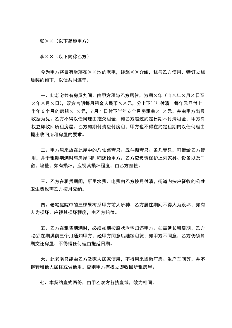 一、此老宅共有房屋九间,由甲方租与乙方居住,为期×年(自×年×月×日至×年×月×日),双方言明每月租金人民币××元,分上下半年付清。每年元旦付上半年6个月的房租× ×元,7月1日付下半年6个月房租共× ×元,并由甲方出具收据为凭。乙方不得以任何理由拖欠租金,如乙方超过约定日期不付清租金,甲方有权立即收回所租房屋。乙方如期付清应付房租,甲方也不得在约定租期内以任何理由提出收回所租房屋的要求。