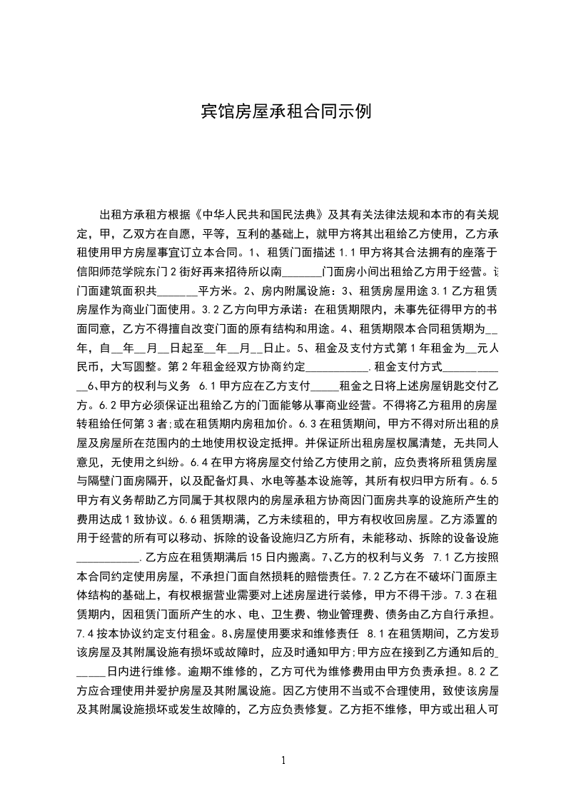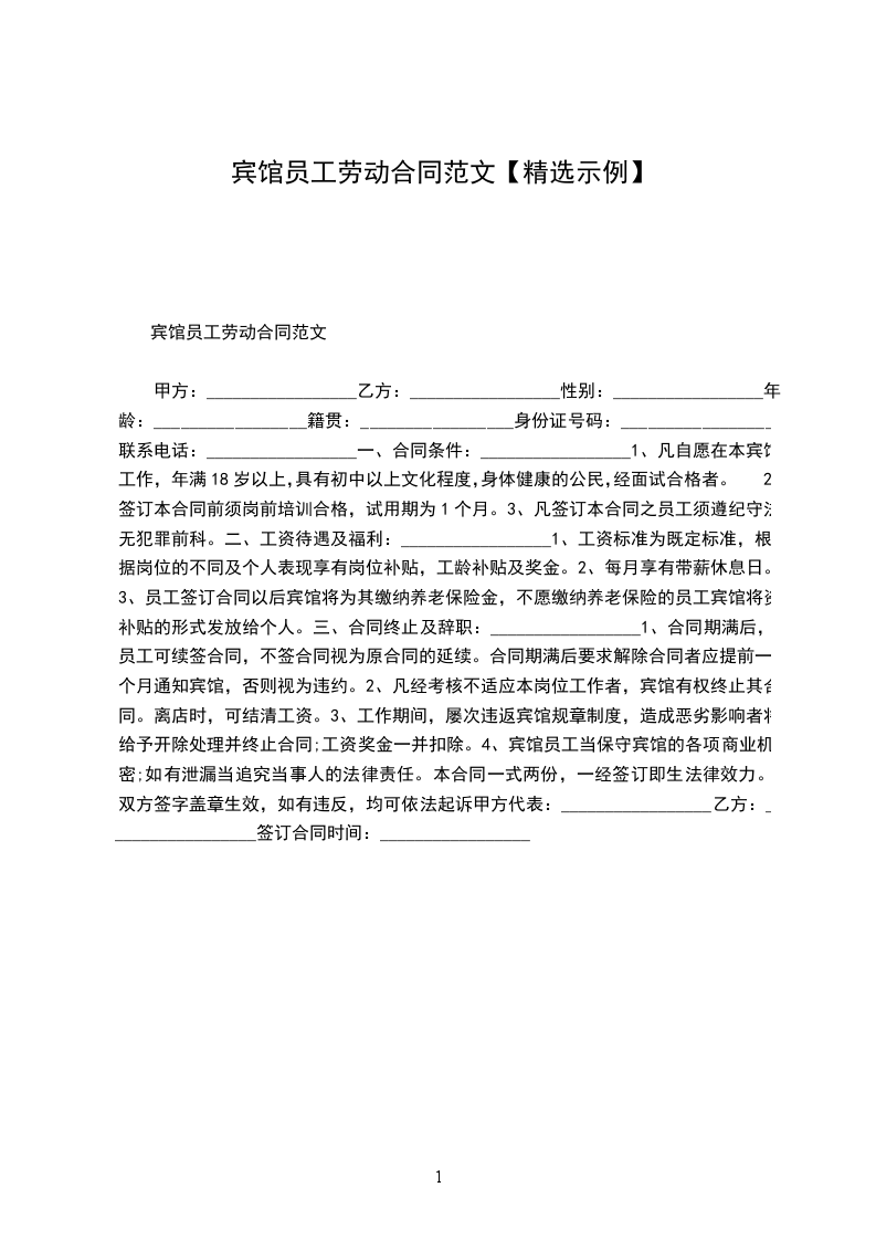 甲方:_________________乙方:_________________性别:_________________年龄:_________________籍贯:_________________身份证号码:_________________联系电话:_________________一、合同条件:_________________1、凡自愿在本宾馆工作,年满18岁以上,具有初中以上文化程度,身体健康的公民,经面试合格者。2、签订本合同前须岗前培训合格,试用期为1个月。3、凡签订本合同之员工须遵纪守法,无犯罪前科。二、工资待遇及福利:_________________1、工资标准为既定标准,根据岗位的不同及个人表现享有岗位补贴,工龄补贴及奖金。2、每月享有带薪休息日。3、员工签订合同以后宾馆将为其缴纳养老保险金,不愿缴纳养老保险的员工宾馆将资补贴的形式发放给个人。三、合同终止及辞职:_________________1、合同期满后,员工可续签合同,不签合同视为原合同的延续。合同期满后要求解除合同者应提前一个月通知宾馆,否则视为违约。2、凡经考核不适应本岗位工作者,宾馆有权终止其合同。离店时,可结清工资。3、工作期间,屡次违返宾馆规章制度,造成恶劣影响者将给予开除处理并终止合同;工资奖金一并扣除。4、宾馆员工当保守宾馆的各项商业机密;如有泄漏当追究当事人的法律责任。本合同一式两份,一经签订即生法律效力。双方签字盖章生效,如有违反,均可依法起诉甲方代表:_________________乙方:_________________签订合同时间:_________________