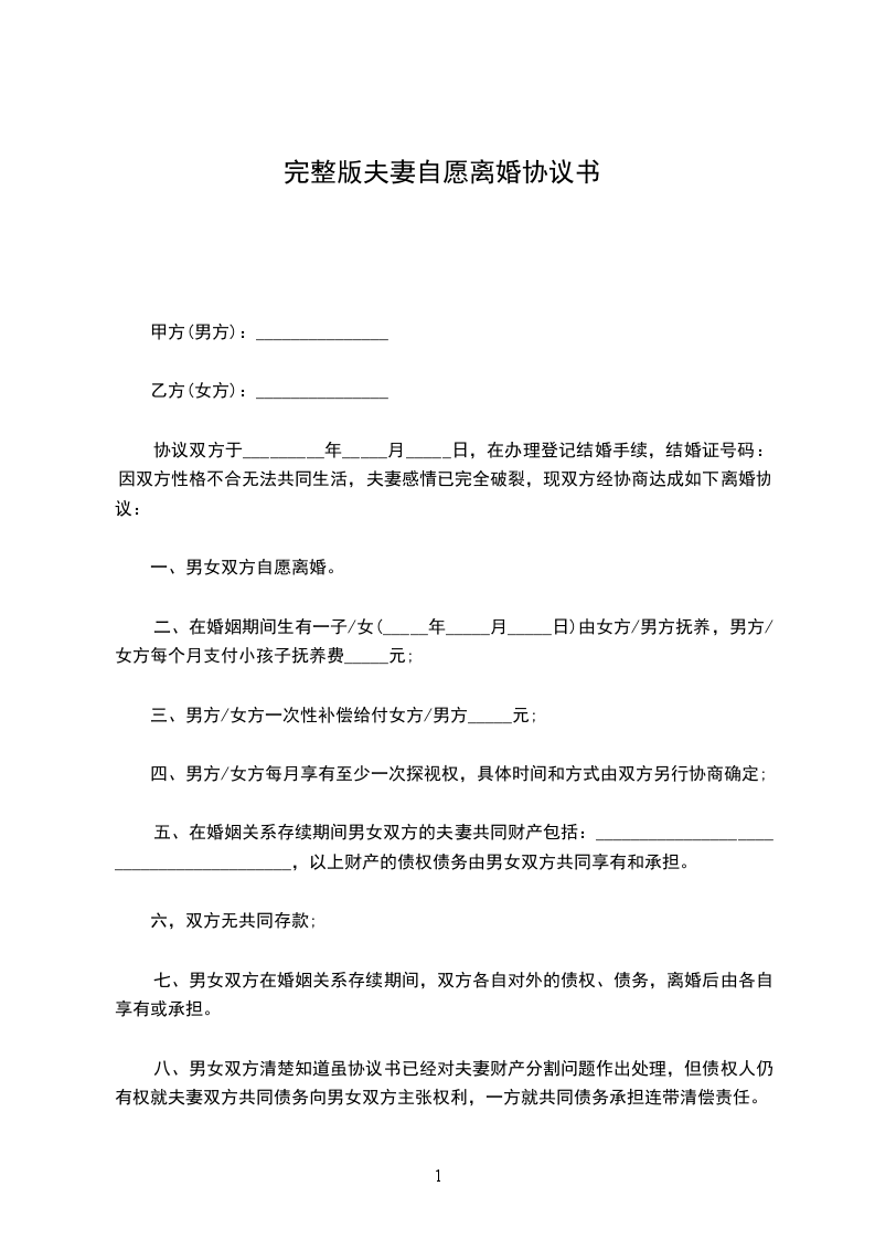 男、女双方于20__________年__________月__________日办理结婚登记,婚后未生育子女。因双方性格不合,无法继续共同生活,夫妻感情完全破裂,已无和好可能。现男女双方本着平等、自愿原则,经协商一致,就双方自愿离婚一事达成协议如下:___________