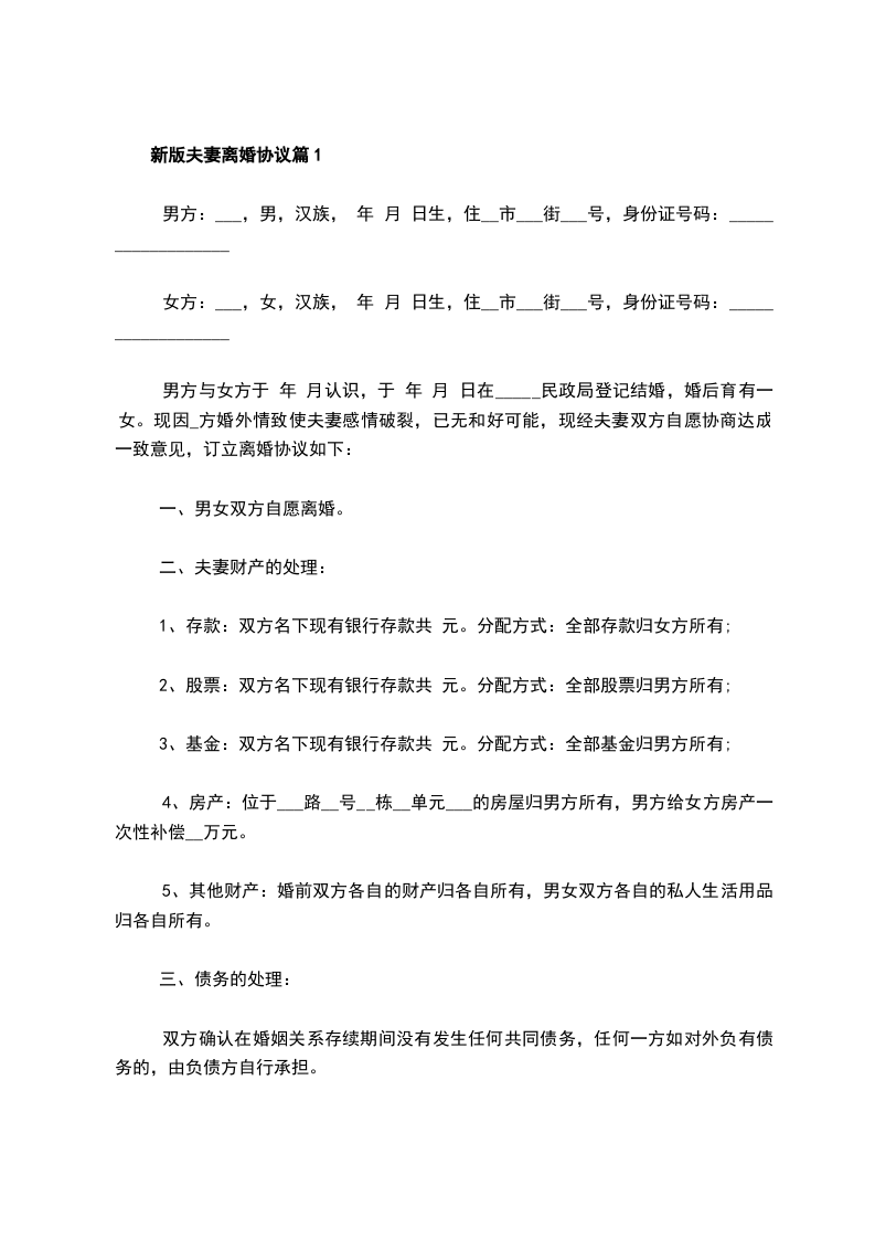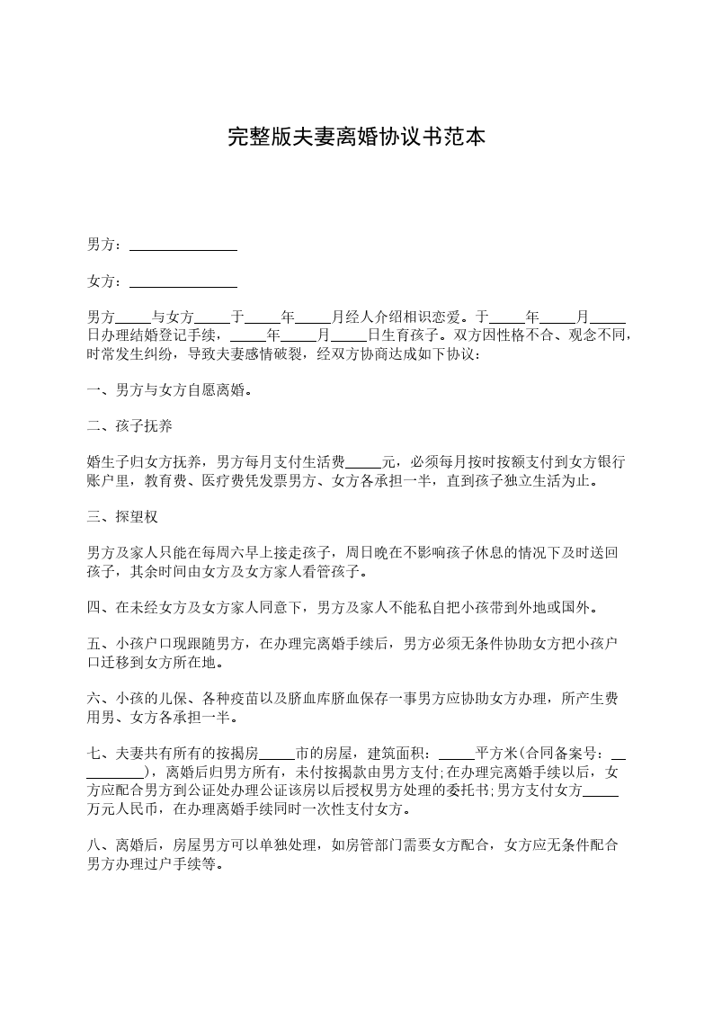 夫妻简单离婚协议书完整版