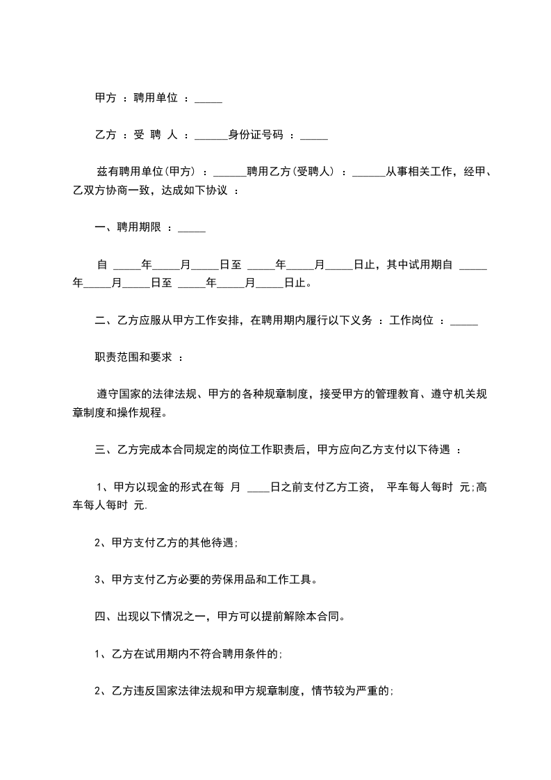 第二条甲方聘用乙方在(科室、部门),担任(岗位、职位)。