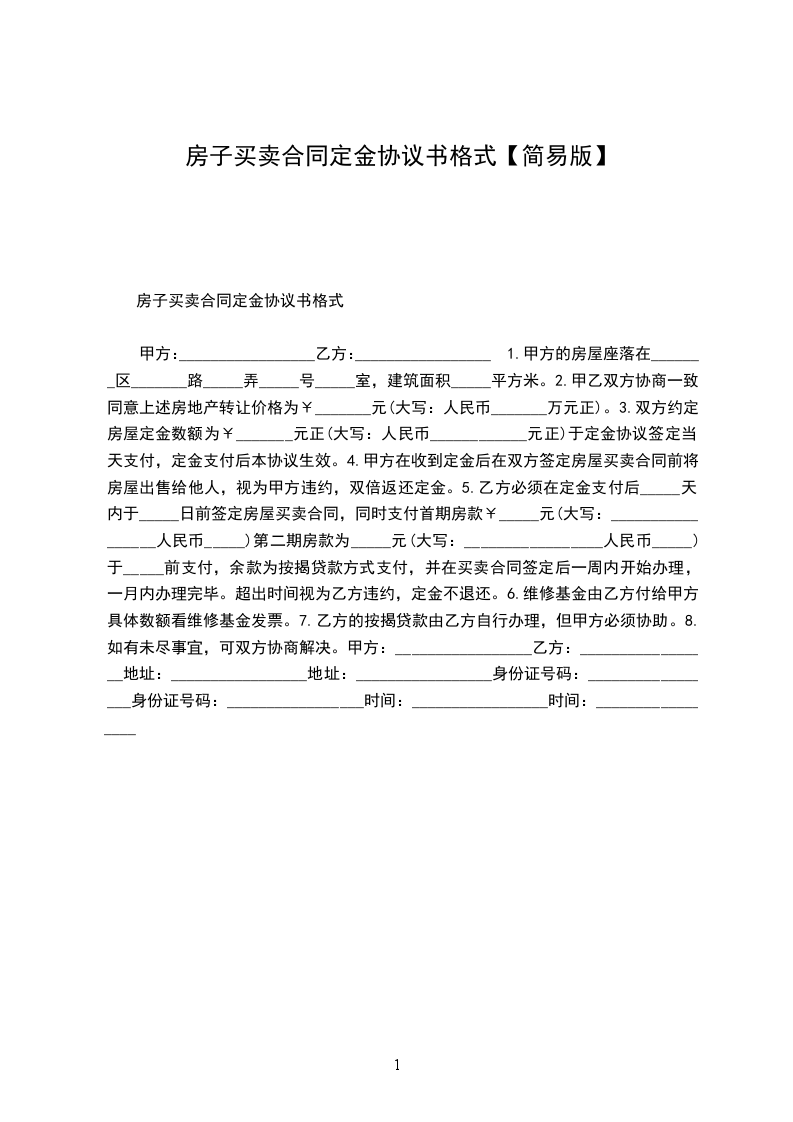 甲方:_________________乙方:_________________1.甲方的房屋座落在_______区_______路_____弄_____号_____室,建筑面积_____平方米。2.甲乙双方协商一致同意上述房地产转让价格为¥_______元(大写:人民币_______万元正)。3.双方约定房屋定金数额为¥_______元正(大写:人民币____________元正)于定金协议签定当天支付,定金支付后本协议生效。4.甲方在收到定金后在双方签定房屋买卖合同前将房屋出售给他人,视为甲方违约,双倍返还定金。5.乙方必须在定金支付后_____天内于_____日前签定房屋买卖合同,同时支付首期房款¥_____元(大写:_________________人民币_____)第二期房款为_____元(大写:_________________人民币_____)于_____前支付,余款为按揭贷款方式支付,并在买卖合同签定后一周内开始办理,一月内办理完毕。超出时间视为乙方违约,定金不退还。6.维修基金由乙方付给甲方,具体数额看维修基金发票。7.乙方的按揭贷款由乙方自行办理,但甲方必须协助。8.如有未尽事宜,可双方协商解决。甲方:_________________乙方:_________________地址:_________________地址:_________________身份证号码:_________________身份证号码:_________________时间:_________________时间:_________________