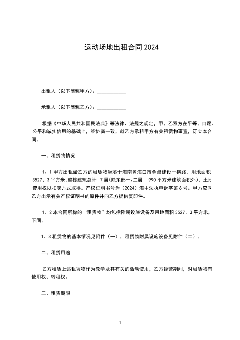 1、1甲方出租给乙方的租赁物坐落于海南省海口市金盘建设一横路,用地面积3527、3平方米,整栋建筑总计7层(除东部一、二层990平方米建筑面积外),土地使用权以拍卖方式取得。产权证明书号为(2024)海中法执申诉字第6号。甲方应向乙方出示有关产权证明书的原件并向乙方提供复印件。