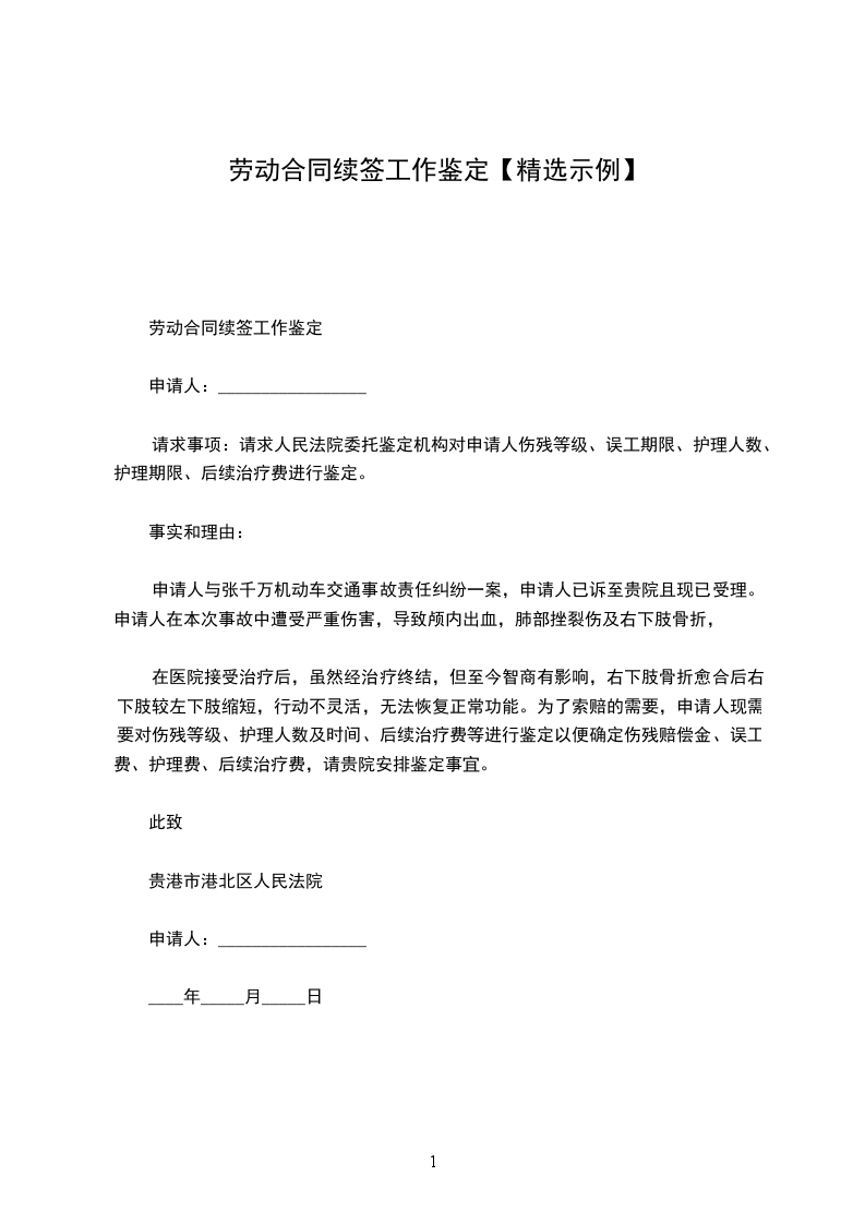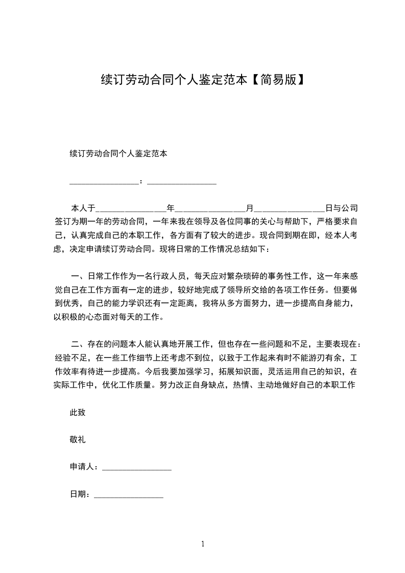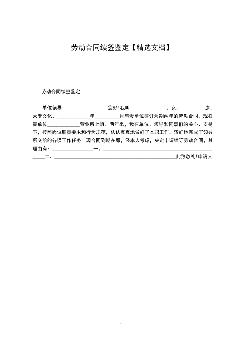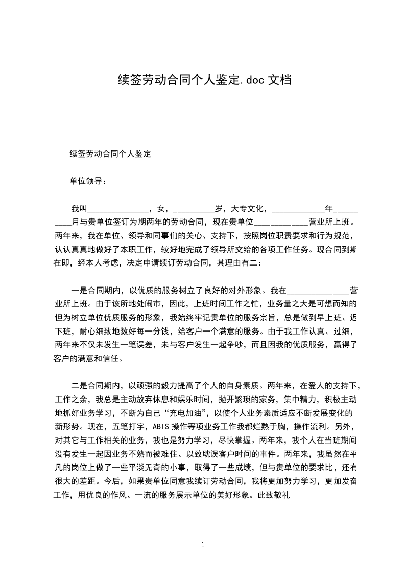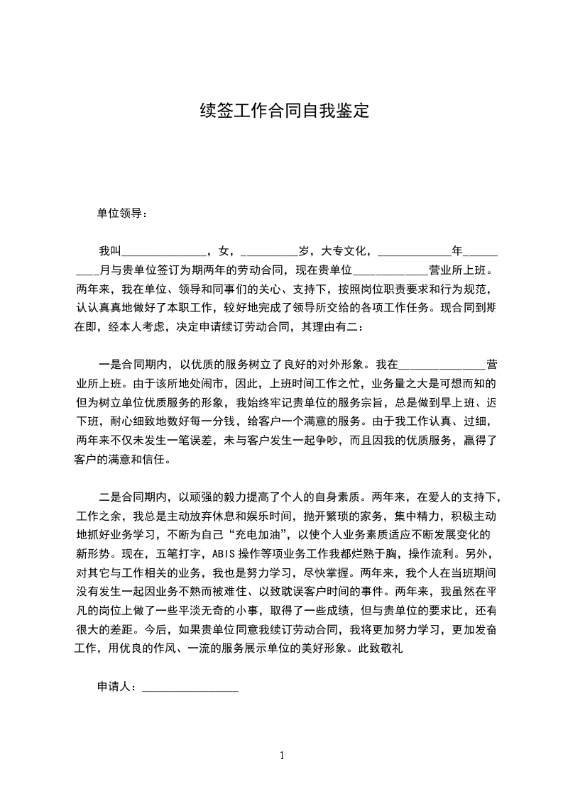 我叫_______________,女,__________岁,大专文化,_____________年__________月与贵单位签订为期两年的劳动合同,现在贵单位_____________营业所上班。两年来,我在单位、领导和同事们的关心、支持下,按照岗位职责要求和行为规范,认认真真地做好了本职工作,较好地完成了领导所交给的各项工作任务。现合同到期在即,经本人考虑,决定申请续订劳动合同,其理由有二: