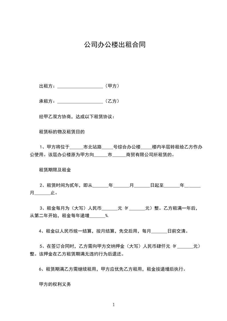 1、甲方将位于______市北站路_____号综合办公楼_____楼内半层转租给乙方作办公使用。该层办公楼原为甲方向______市______商贸有限公司所租赁的。