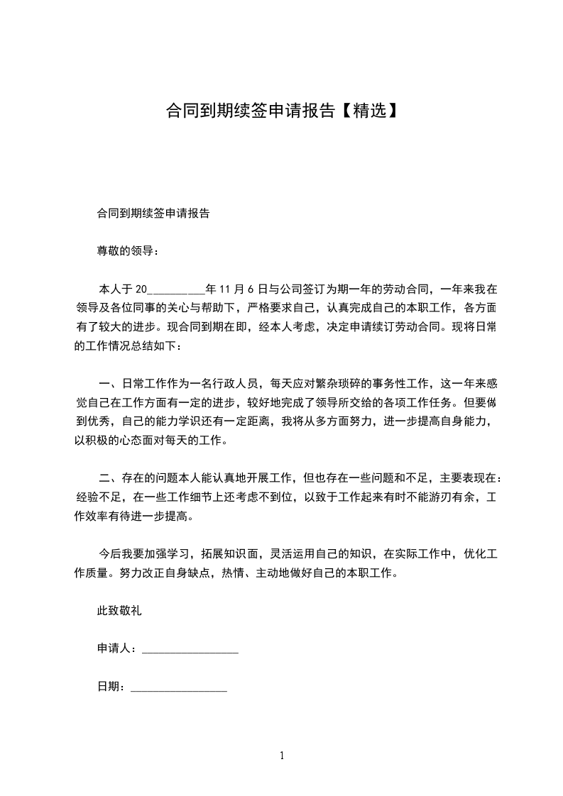 本人于20__________年11月6日与公司签订为期一年的劳动合同,一年来我在领导及各位同事的关心与帮助下,严格要求自己,认真完成自己的本职工作,各方面有了较大的进步。现合同到期在即,经本人考虑,决定申请续订劳动合同。现将日常的工作情况总结如下: