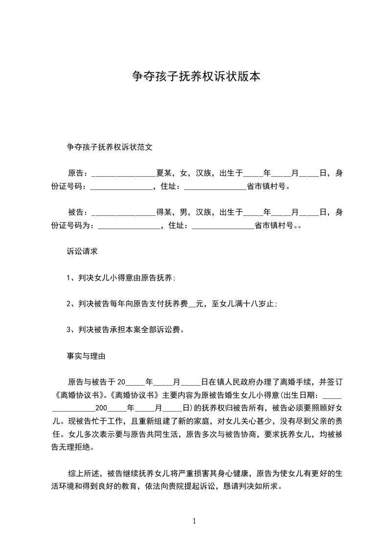 1.判令婚生女儿_______________由原告抚养;