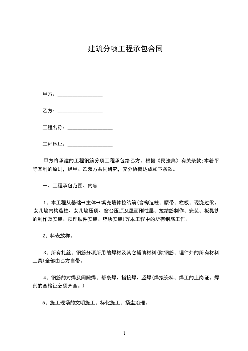 甲方将承建的工程钢筋分项工程承包给乙方。根据《民法典》有关条款;本着平等互利的原则,经甲、乙双方共同研究,充分协商达成如下条款。