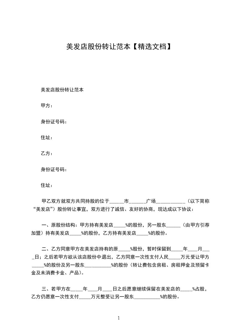 甲乙双方就双方共同持股的位于______市_______广场____________(以下简称“美发店”)股份转让事宜,双方进行了诚信、友好的协商,现达成以下协议: