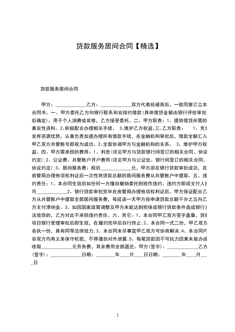 甲方:_____________乙方:_____________双方代表经磋商后,一致同意订立本合同书。一、甲方委托乙方向银行联系和安排约借款(具体借贷金额由银行评估审批后确定),用于个人消费或装修,乙方接受委托。二、甲方职责:1、提供借贷所需的真实性资料。2、积极配合办理相关手续。3、维护乙方权益。三、乙方职责:1、充分发挥资源优势,认真负责加速办理所有借款手续,在金融机构审批后,借款全额汇入甲乙双方共管账号即视为成功。2、全面协调甲方与金融机构的关系。3、维护甲方权益。四、甲方需承担的费用:1、利息(详见甲方与贷款银行间签订的相关合同、协议约定);2、公证费、共管账户开户费用(详见甲方与公证处、银行间签订的相关合同、协议约定);3、居间服务费:税后_____________元,甲方须在银行贷款审批成功,在房管局办理他项权利证后一次性将贷款总额的居间服务费从共管账户中提取。五、违约责任:1、本合同生效后如任何一方擅自撤销委托则视作违约。违约方即须支付人民币_____________2、银行贷款审批完毕在房管局办理他项权利证后,甲方保证配合乙方从共管账户中提取全部居间服务费,每延误一天甲方按申请贷款总额千分之五向乙方支付滞纳金。3、如因国家政策调整及甲方未能达到担保或银行贷款条件造成银行无法放贷的,乙方对此不承担违约责任。六、其它:1、本合同甲乙双方签字盖章,贷款项目银行受理审批后即生效,在履约完毕后自行终止;2、本合同一式二份,甲乙双方各执一份,具有同等法律效力;3、本合同未尽事宜甲乙双方可协商解决;4、本合同内容双方均有义务保守机密,不得擅自对外泄露;5、每笔贷款因不可抗力因素未能办成收取_____________元劳务费,其余费用全部退还。甲方(签字):_____________乙方(签字):_____________日期:________年____月____日日期:________年____月____日