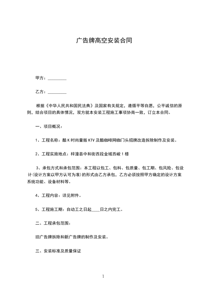 一、甲方指定乙方为其高空施工执行时间:____年____月____日至____年____月____日止。