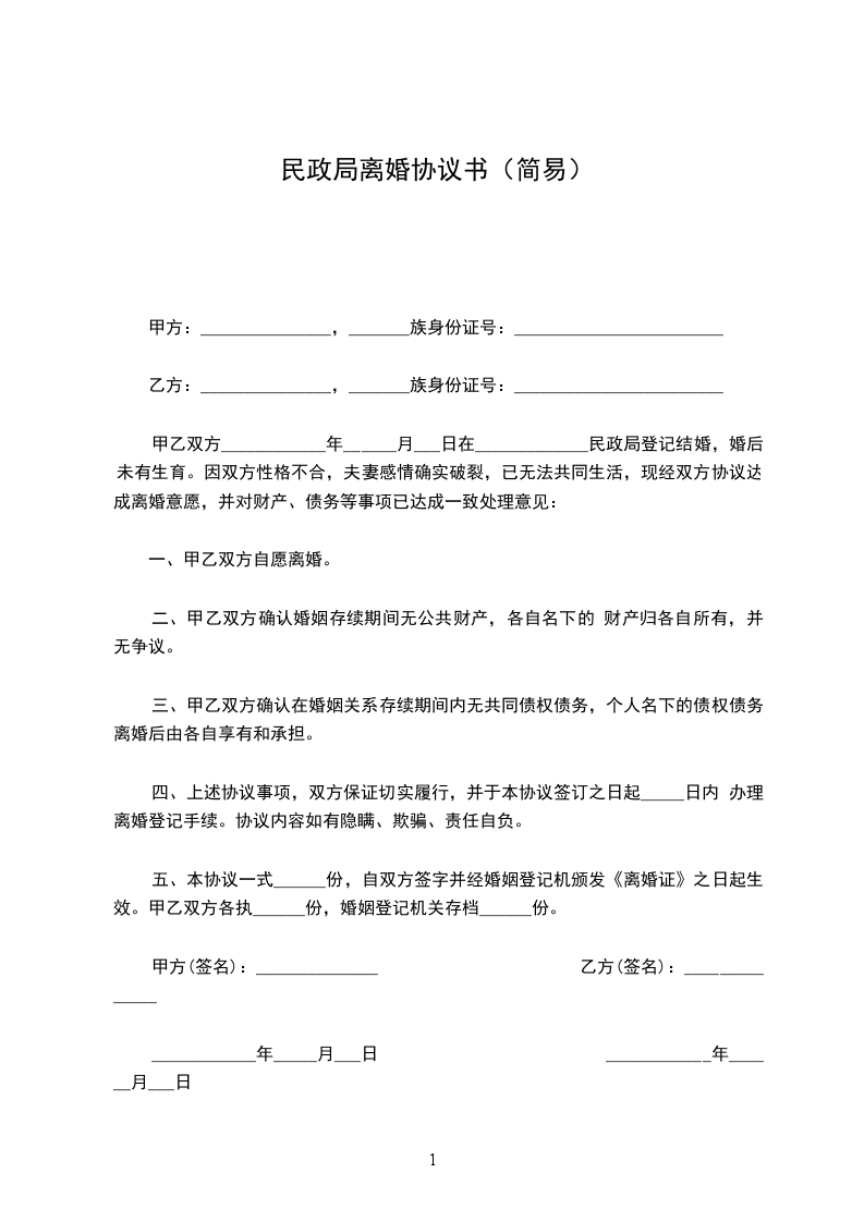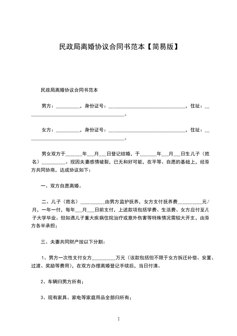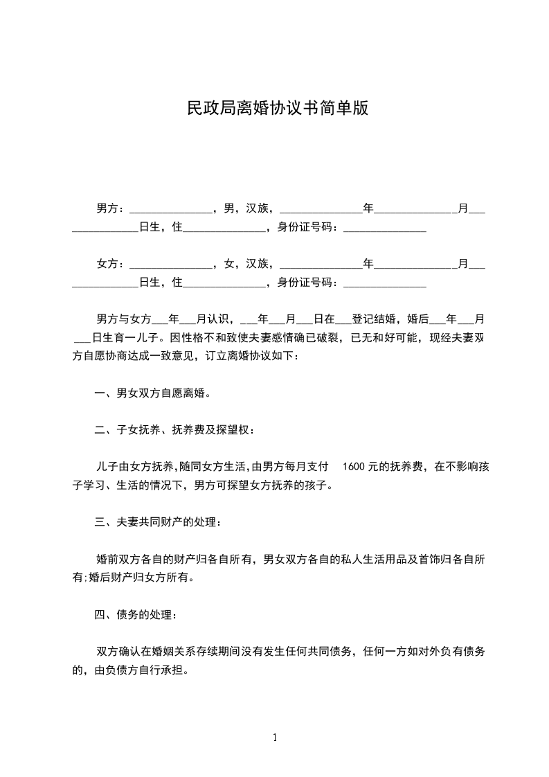 男方与女方于____年__月认识,于______年____月____日在登记结婚,婚后于______年____月____日生育一儿子/女儿,名。因致使夫妻感情破裂,已无和好可能,现经夫妻双方自愿协商达成一致意见,订立离婚协议如下: