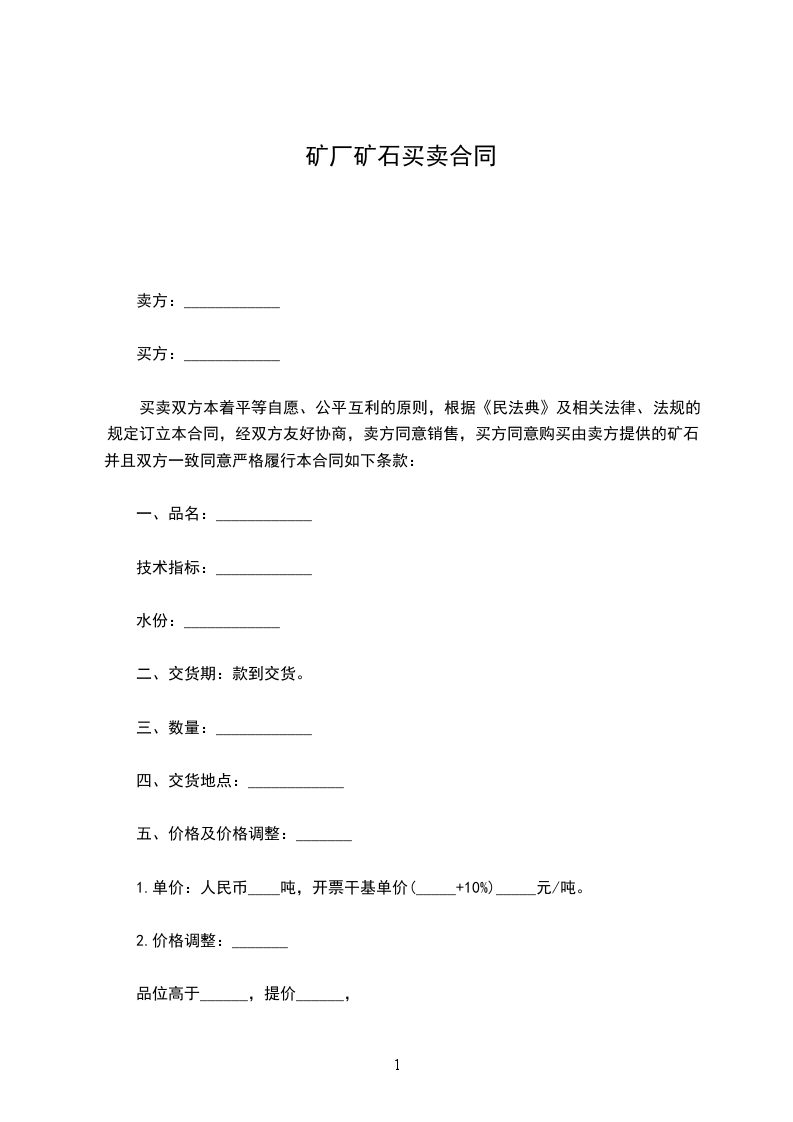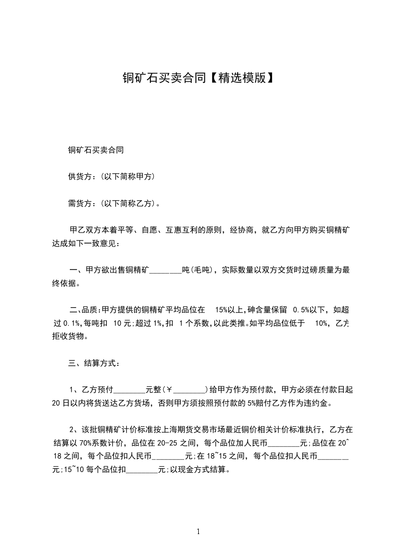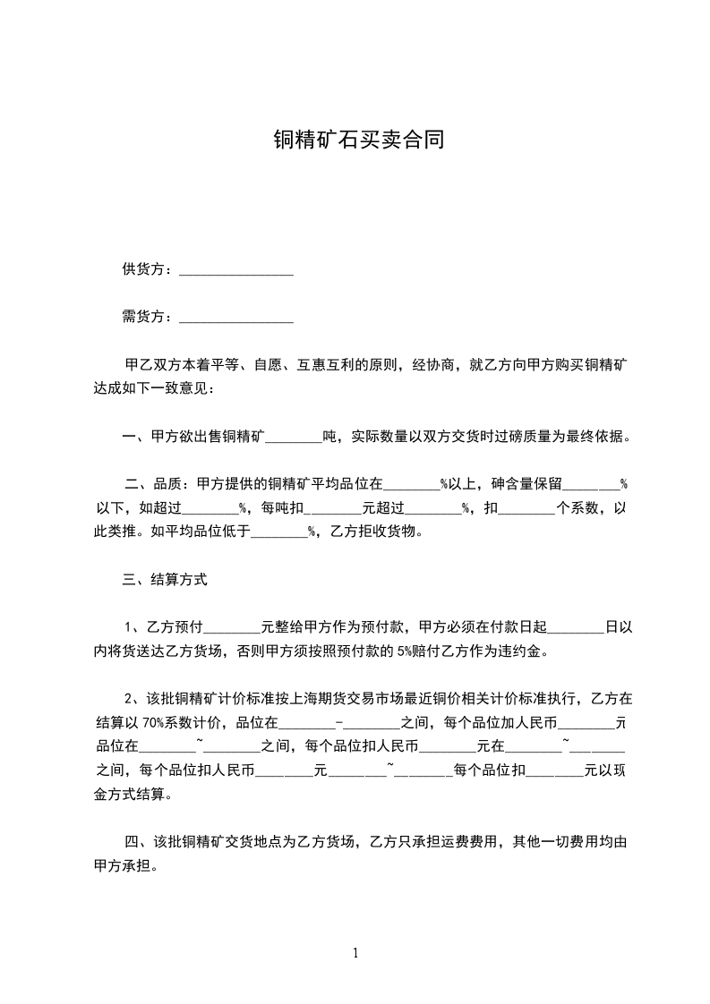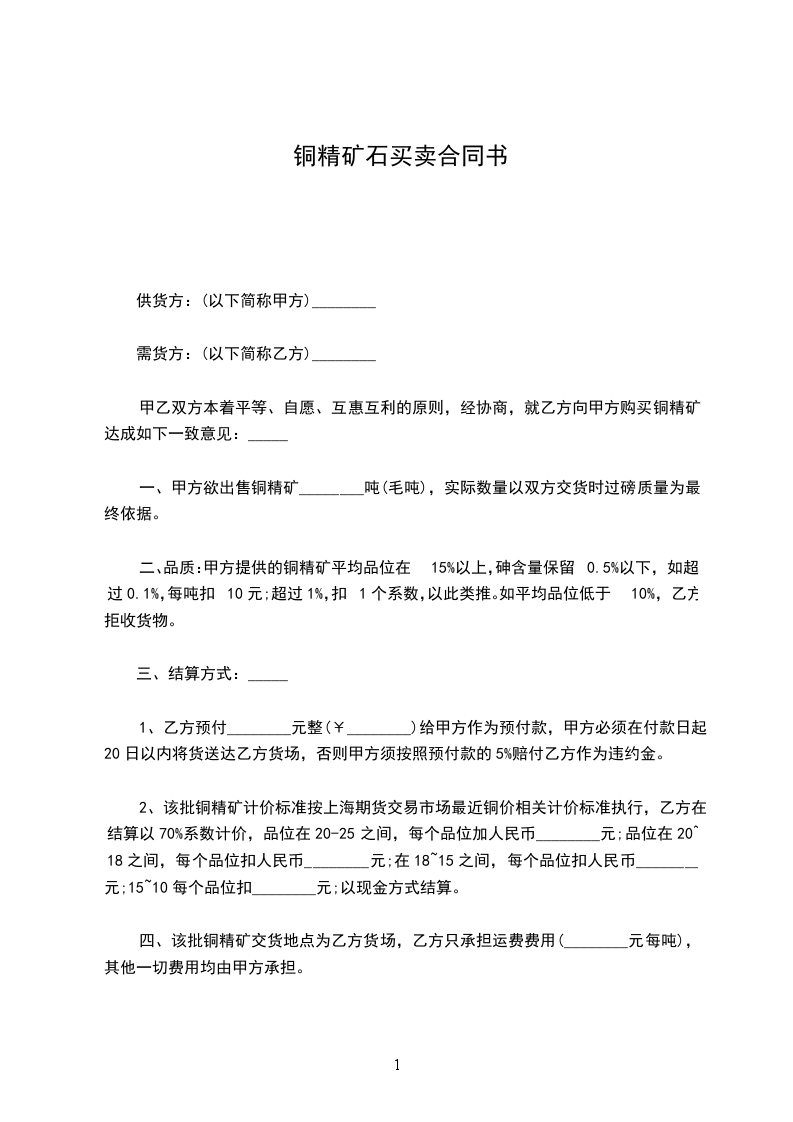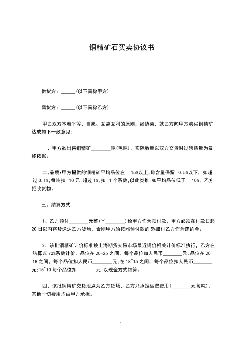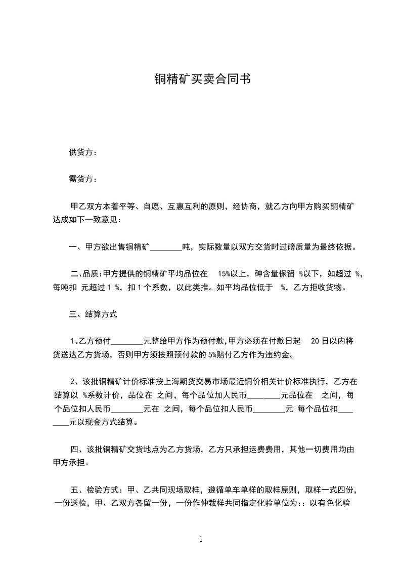 一、甲方欲出售铜精矿________吨(毛吨),实际数量以双方交货时过磅质量为最终依据。