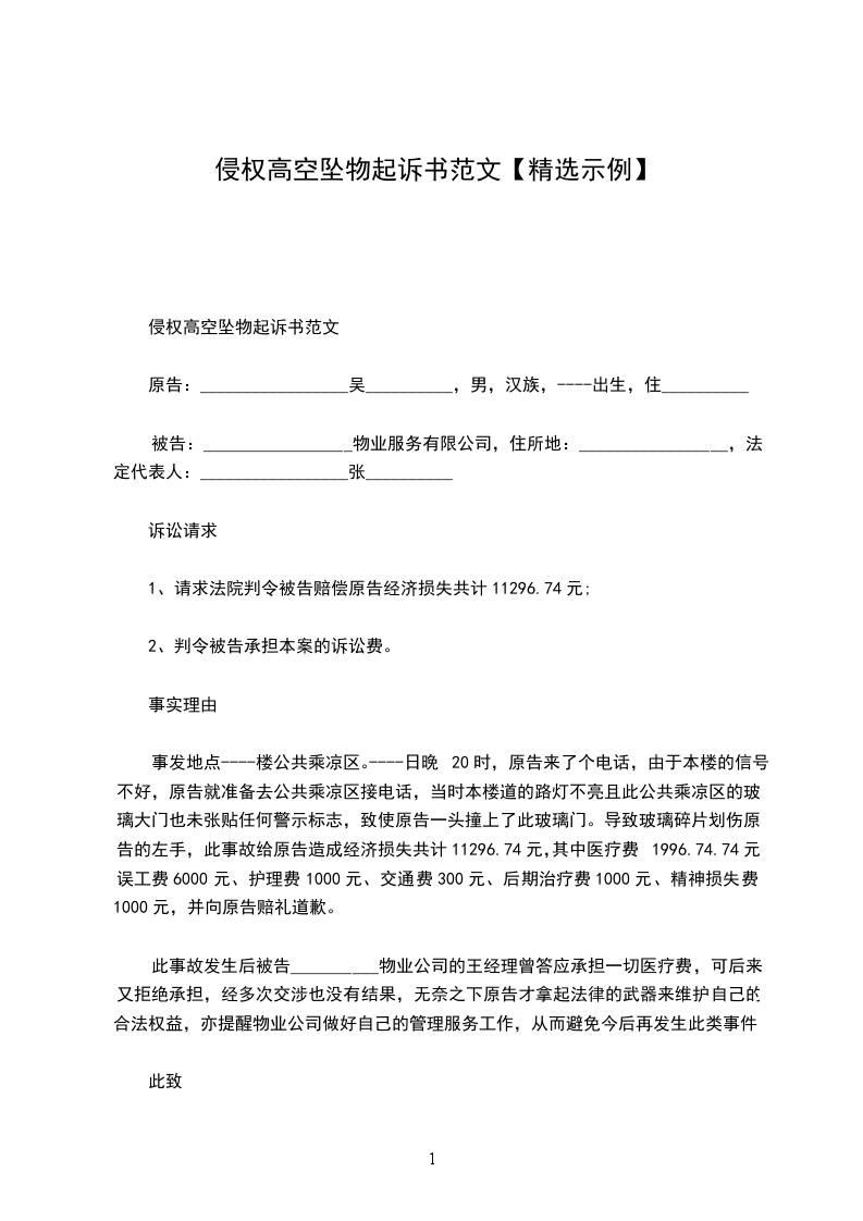 侵权高空坠物起诉书范文
