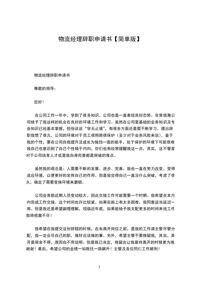 物流经理辞职申请书