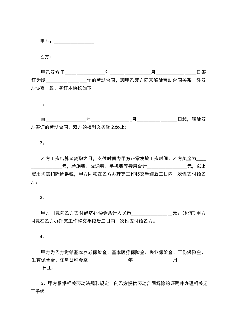 甲乙双方于_________________年_________________月_________________日签订为期_________________年的劳动合同,现甲乙双方同意解除劳动合同关系。经双方协商一致,签订本协议如下: