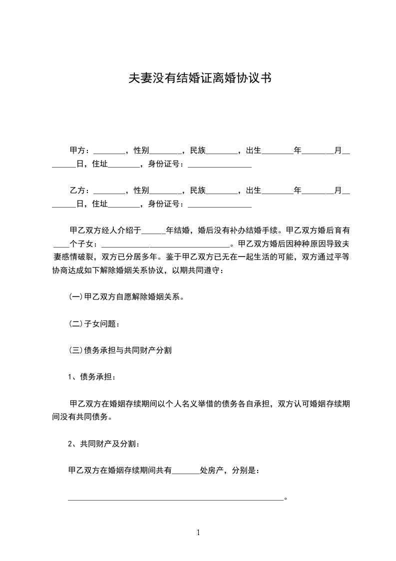 甲乙双方经人介绍于______年结婚,婚后没有补办结婚手续。甲乙双方婚后育有____个子女:________________________________。甲乙双方婚后因种种原因导致夫妻感情破裂,双方已分居多年。鉴于甲乙双方已无在一起生活的可能,双方通过平等协商达成如下解除婚姻关系协议,以期共同遵守: