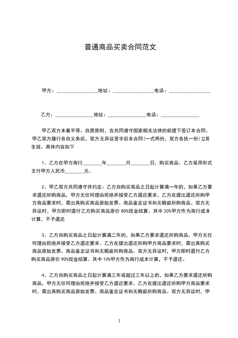 1、乙方在甲方商行________年________月________日,购买商品。乙方采用形式支付甲方人民币________元。