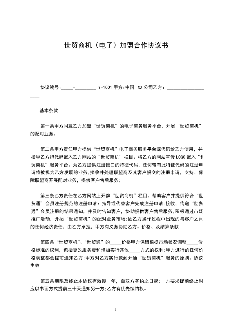 第一条甲方同意乙方加盟“世贸商机”的电子商务服务平台,开展“世贸商机”的配对业务。