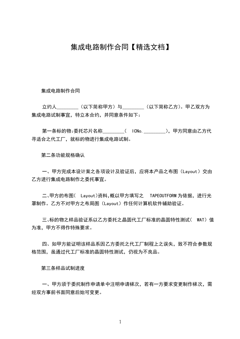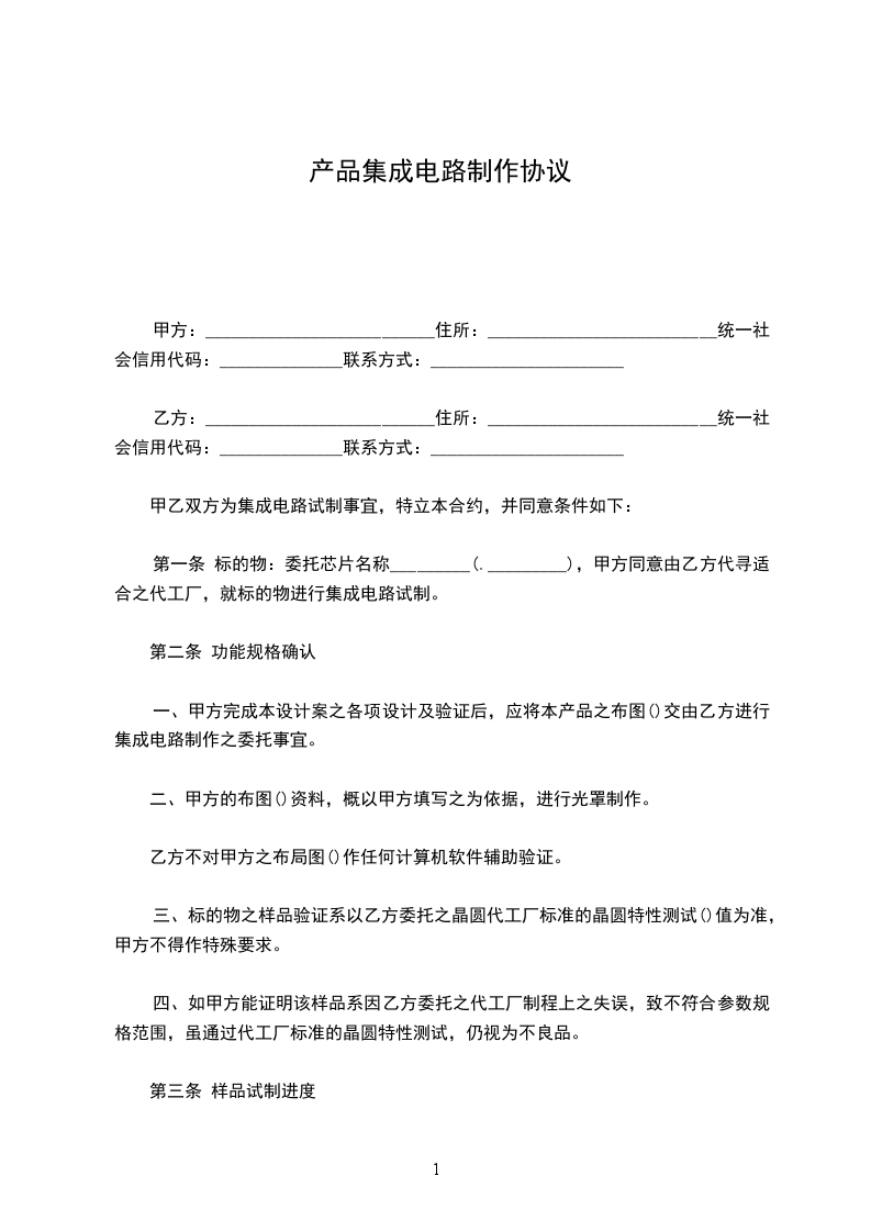 立约人_________(以下简称甲方)与_________(以下简称乙方)。甲乙双方为集成电路试制事宜,特立本合约,并同意条件如下:
