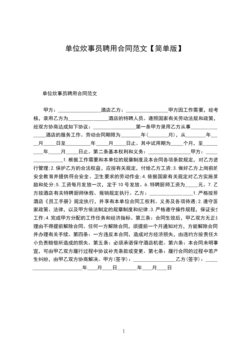 甲方:_________________酒店乙方:_________________甲方因工作需要,经考核,录用乙方为________________酒店的特聘人员。遵照国家有关劳动法规和政策,经双方协商达成如下协议:_________________第一条甲方录用乙方从事________________酒店的服务工作。劳动合同期限为________年(________月),从________年_____月_____日至__________年_____月_____日止。其中试用期为_____个月,至__________年_____月_____日止。第二条基本权利和义务:_________________甲方:_________________1.根据工作需要和本单位的规章制度及本合同各项条款规定,对乙方进行管理;2.保护乙方的合法权益,应按有关规定,付给乙方工资;3.做好乙方上岗前的安全教育并提供符合安全、卫生要求的劳动作业;4.依据国家有关规定对乙方实施奖励和处分;5.工资每月发放一次,定于10号发放。6.特聘厨师工资为_____元。7.乙方按酒店有关特聘厨师休假、报销规定执行。乙方:_________________1.严格按照酒店《员工手册》规定执行,并享有本单位合同工权利、义务及各项待遇;2.遵守国家政策、法律,以及甲方依法制定的规章制度和纪律;3.严格遵守操作规程,保证安全工作;4.完成甲方分配的工作任务和经济指标。第三条:合同生效后,甲乙双方无正当理由不得提前解除合同。任何一方解除合同,须提前一个月通知对方,方能解除合同,并办理有关手续。第四条:一方违反本合同,造成对方经济损失,由违约方按责任大小负责赔偿所造成的损失。第五条:必须承诺保守酒店机密。第六条:本合同未明事宜,可由甲乙双方履行过程中协议补充条款或变更。第七条:履行合同的过程中若产生纠纷,由甲乙双方协商解决。甲方(签字):_________________乙方(签字):_________________________年____月____日________年____月____日