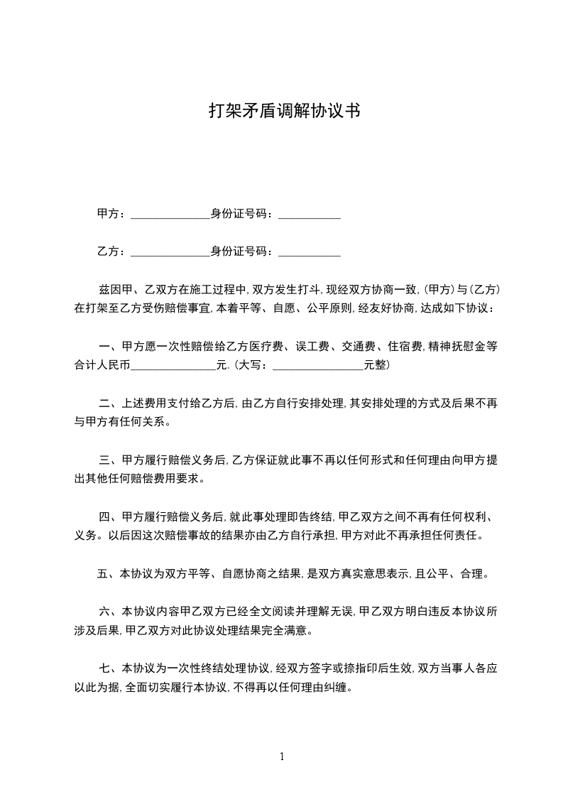 兹因甲、乙双方在施工过程中,双方发生打斗,现经双方协商一致,(甲方)与(乙方)在打架至乙方受伤赔偿事宜,本着平等、自愿、公平原则,经友好协商,达成如下协议: