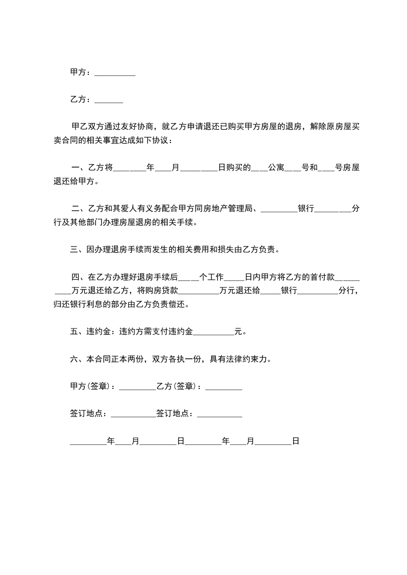 四、在乙方办理好退房手续后五个工作日内甲方将乙方的首付款________万元退还给乙方,将购房贷款________万元退还给________银行________分行,归还银行利息的部分由乙方负责偿还。