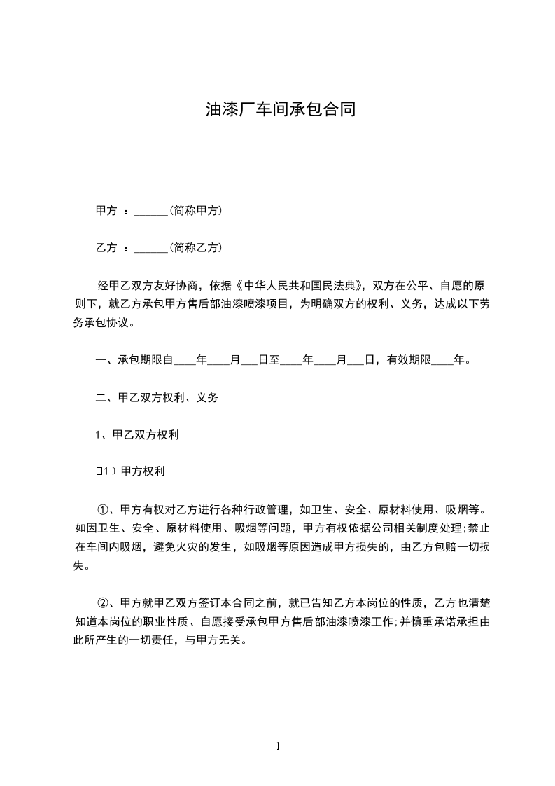 甲、乙双方本着平等、自愿、协商一致的原则,就乙方承包甲方的起重设备油漆工程(以下简称工程)的有关事宜,达成如下协议:_________________一、工程地址:_________________双胜厂区车间内