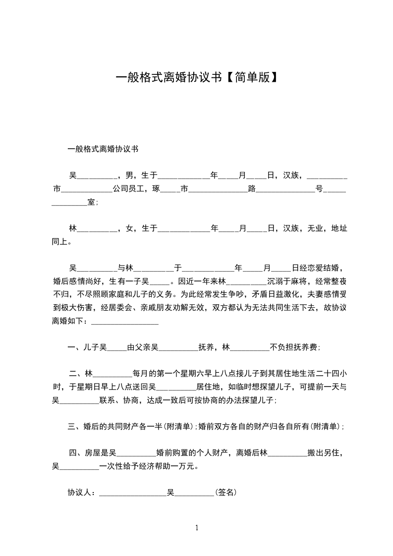 一般格式离婚协议书