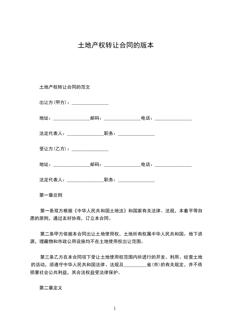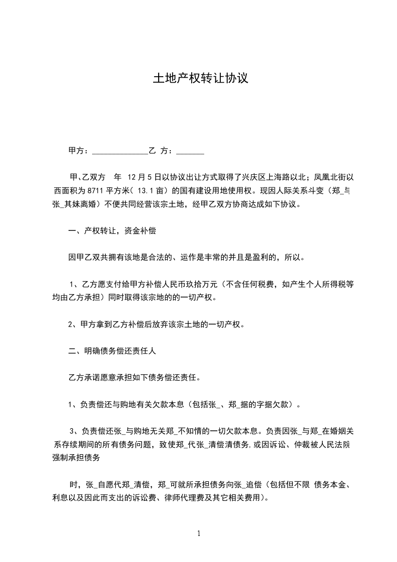 土地产权转让合同的范文