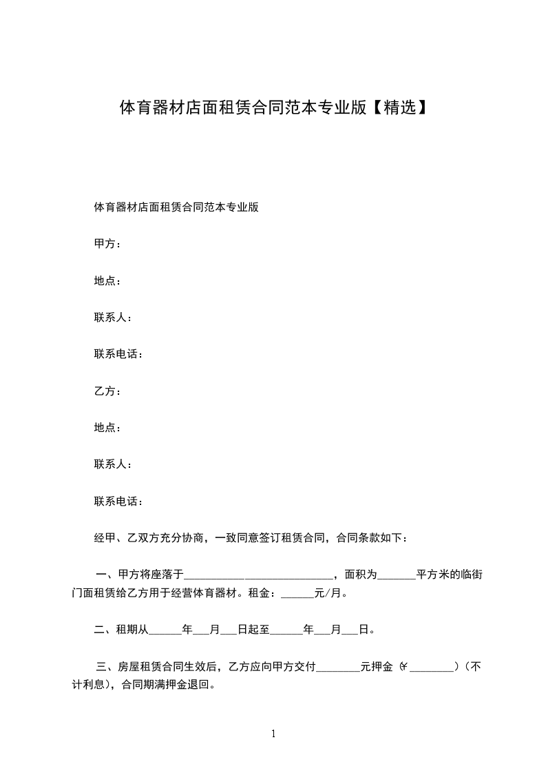 一、甲方将座落于___________________________,面积为_______平方米的临街门面租赁给乙方用于经营体育器材。租金:______元/月。