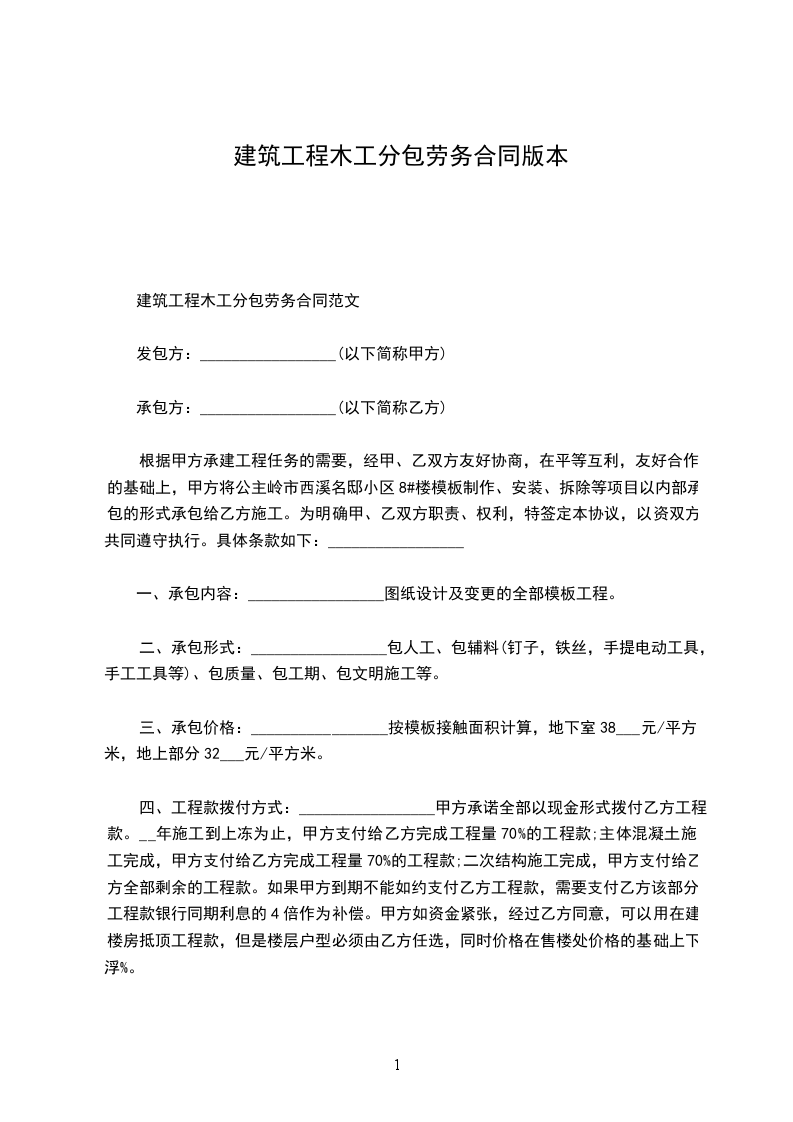 二、承包形式:_________________包人工、包辅料(钉子,铁丝,手提电动工具,手工工具等)、包质量、包工期、包文明施工等。