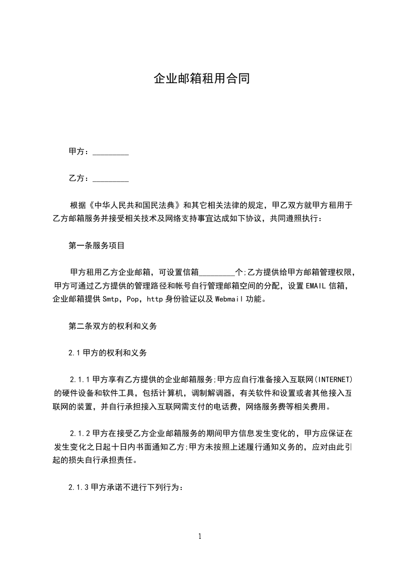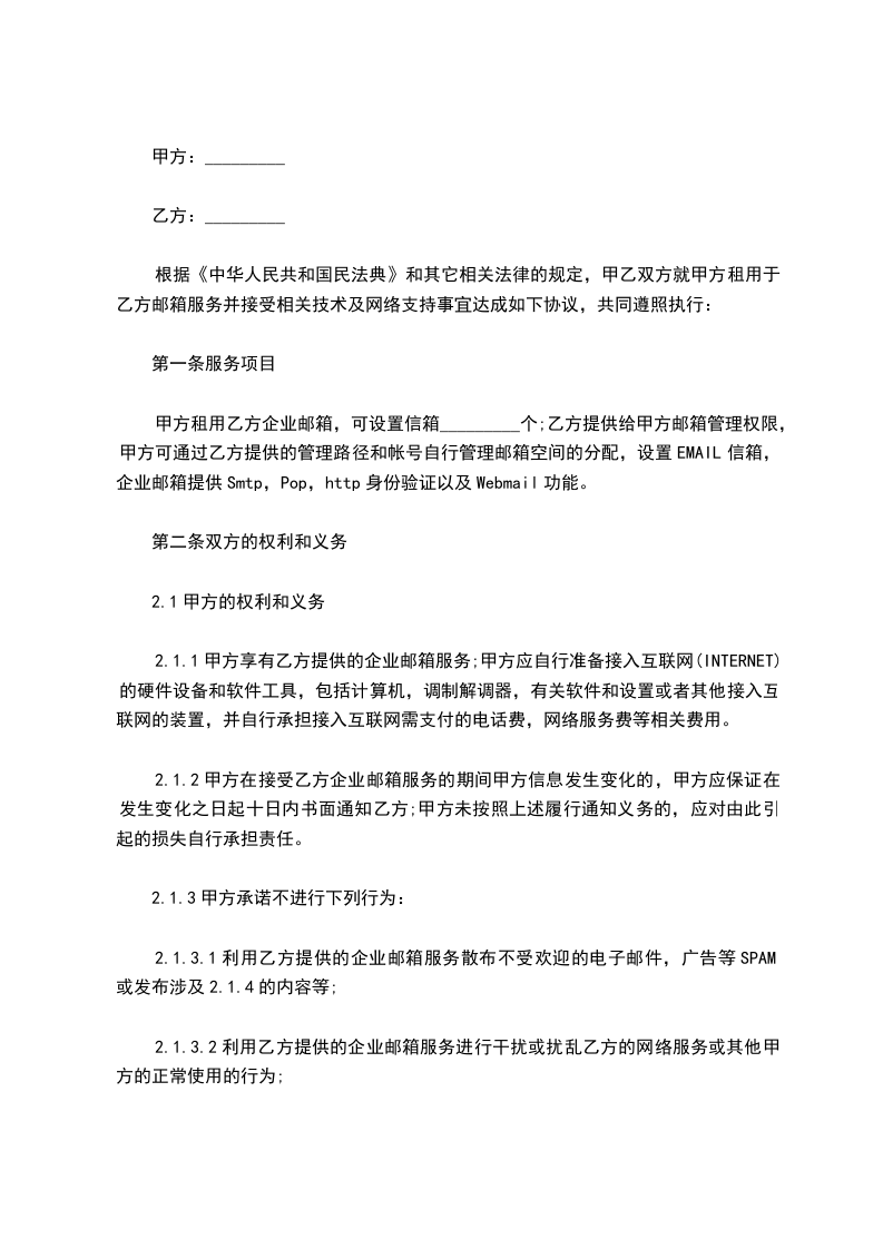 根据《中华人民共和国民法典》和其它相关法律的规定,甲乙双方就甲方租用于乙方邮箱服务并接受相关技术及网络支持事宜达成如下协议,共同遵照执行: