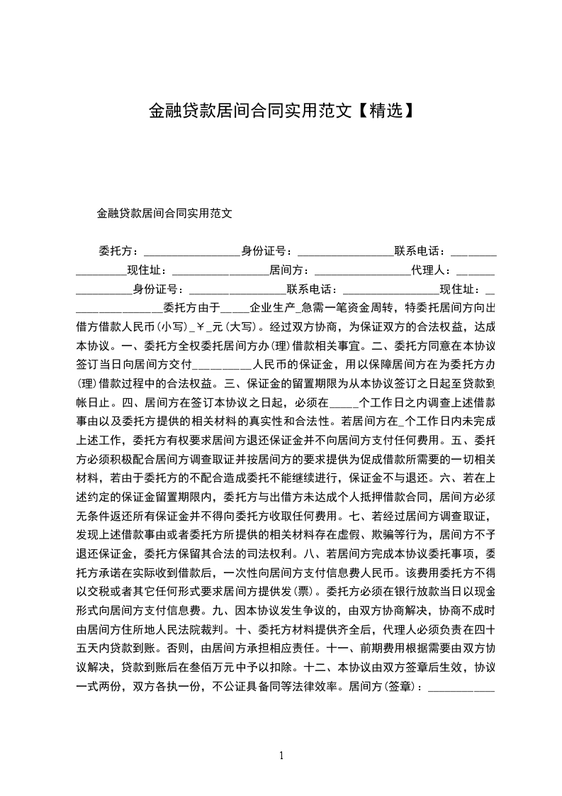 委托方:_________________身份证号:_________________联系电话:_________________现住址:_________________居间方:_________________代理人:_________________身份证号:_________________联系电话:_________________现住址:_________________委托方由于_____企业生产_急需一笔资金周转,特委托居间方向出借方借款人民币(小写)_¥_元(大写)。经过双方协商,为保证双方的合法权益,达成本协议。一、委托方全权委托居间方办(理)借款相关事宜。二、委托方同意在本协议签订当日向居间方交付__________人民币的保证金,用以保障居间方在为委托方办(理)借款过程中的合法权益。三、保证金的留置期限为从本协议签订之日起至贷款到帐日止。四、居间方在签订本协议之日起,必须在_____个工作日之内调查上述借款事由以及委托方提供的相关材料的真实性和合法性。若居间方在_个工作日内未完成上述工作,委托方有权要求居间方退还保证金并不向居间方支付任何费用。五、委托方必须积极配合居间方调查取证并按居间方的要求提供为促成借款所需要的一切相关材料,若由于委托方的不配合造成委托不能继续进行,保证金不与退还。六、若在上述约定的保证金留置期限内,委托方与出借方未达成个人抵押借款合同,居间方必须无条件返还所有保证金并不得向委托方收取任何费用。七、若经过居间方调查取证,发现上述借款事由或者委托方所提供的相关材料存在虚假、欺骗等行为,居间方不予退还保证金,委托方保留其合法的司法权利。八、若居间方完成本协议委托事项,委托方承诺在实际收到借款后,一次性向居间方支付信息费人民币。该费用委托方不得以交税或者其它任何形式要求居间方提供发(票)。委托方必须在银行放款当日以现金形式向居间方支付信息费。九、因本协议发生争议的,由双方协商解决,协商不成时,由居间方住所地人民法院裁判。十、委托方材料提供齐全后,代理人必须负责在四十五天内贷款到账。否则,由居间方承担相应责任。十一、前期费用根据需要由双方协议解决,贷款到账后在叁佰万元中予以扣除。十二、本协议由双方签章后生效,协议一式两份,双方各执一份,不公证具备同等法律效率。居间方(签章):_________________委托方(签章):___________________________年___________月___________日__________年___________月___________日