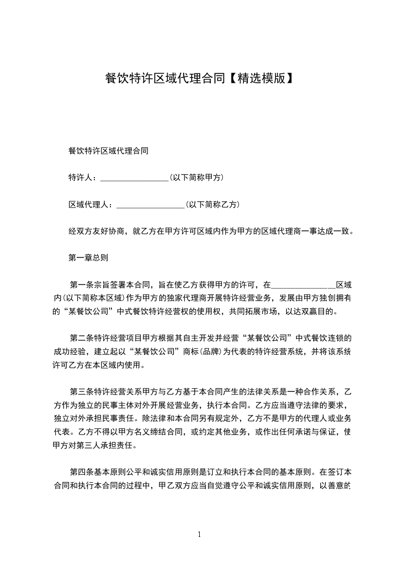 第一条宗旨签署本合同,旨在使乙方获得甲方的许可,在________________区域内(以下简称本区域)作为甲方的独家代理商开展特许经营业务,发展由甲方独创拥有的“某餐饮公司”中式餐饮特许经营权的使用权,共同拓展市场,以达双赢目的。
