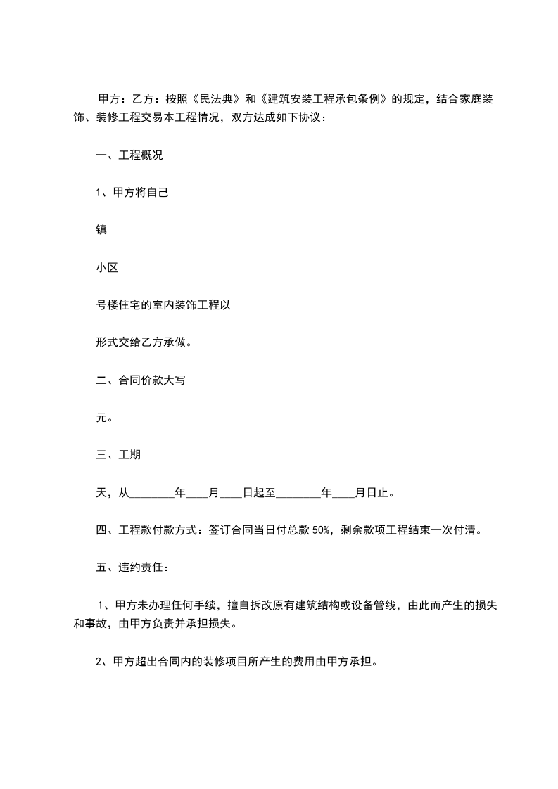 按照《中华人民共和国民法典》、《中华人民共和国建筑法》、《住宅室内装饰装修管理办法》及其他有关法律、行政法规的规定,遵循平等、自愿、公平和诚实信用的原则,结合本装饰装修工程施工具体情况,双方协商达成如下协议。