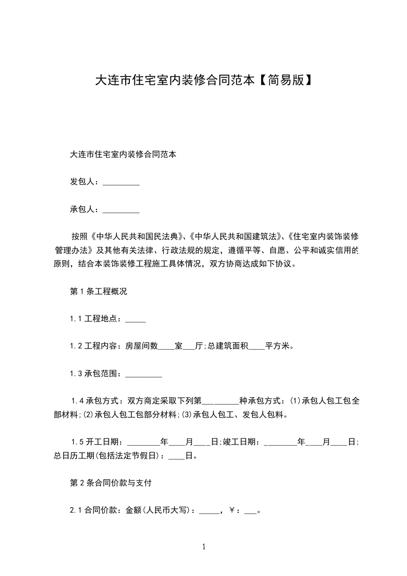大连市住宅室内装修合同范本