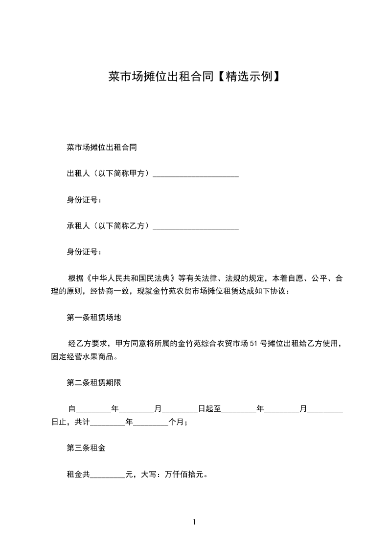 根据《中华人民共和国民法典》等有关法律、法规的规定,本着自愿、公平、合理的原则,经协商一致,现就金竹苑农贸市场摊位租赁达成如下协议: