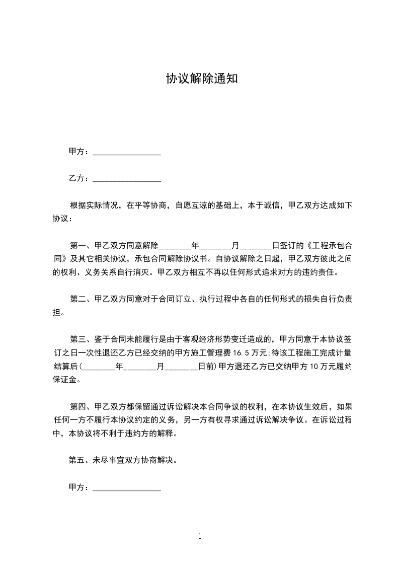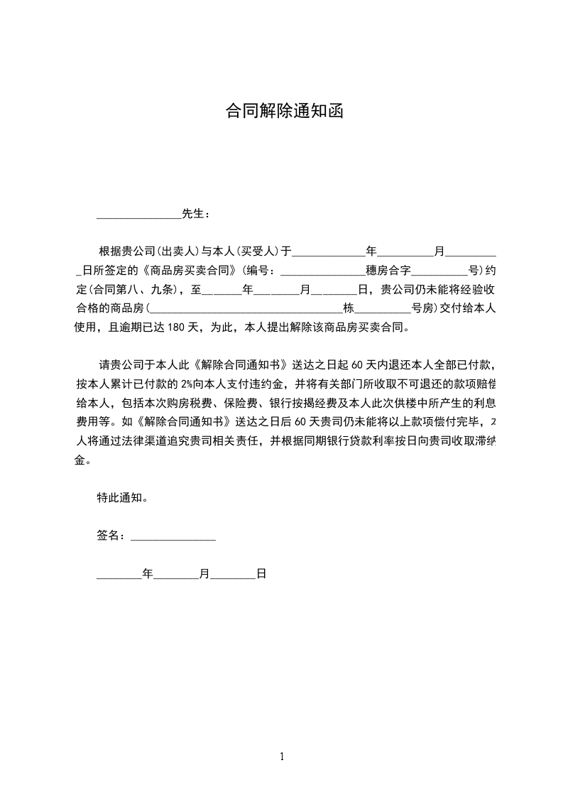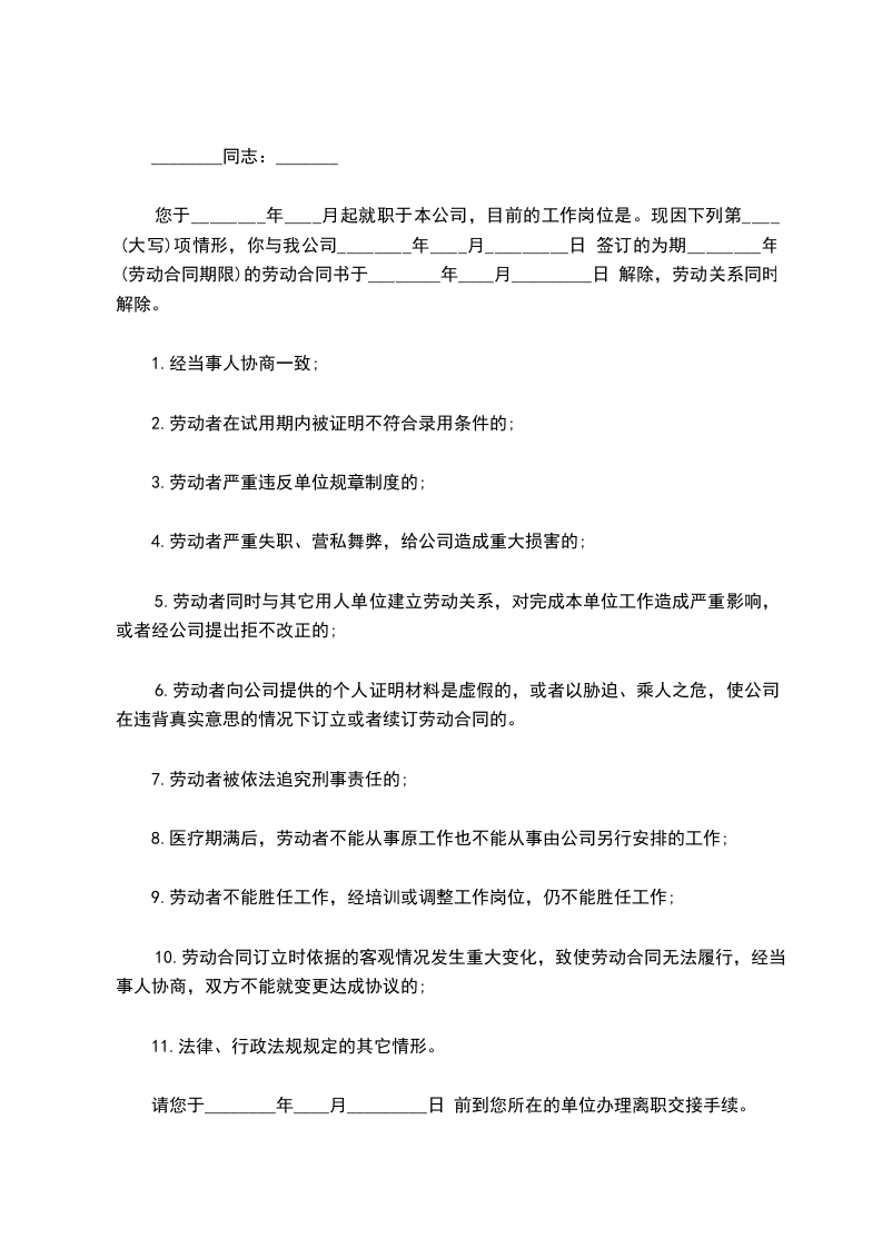 您于____年__月起就职于本公司,目前的工作岗位是。现因下列第____(大写)项情形,你与我公司______年____月____日签订的为期__年(劳动合同期限)的劳动合同书于______年____月____日解除,劳动关系同时解除。