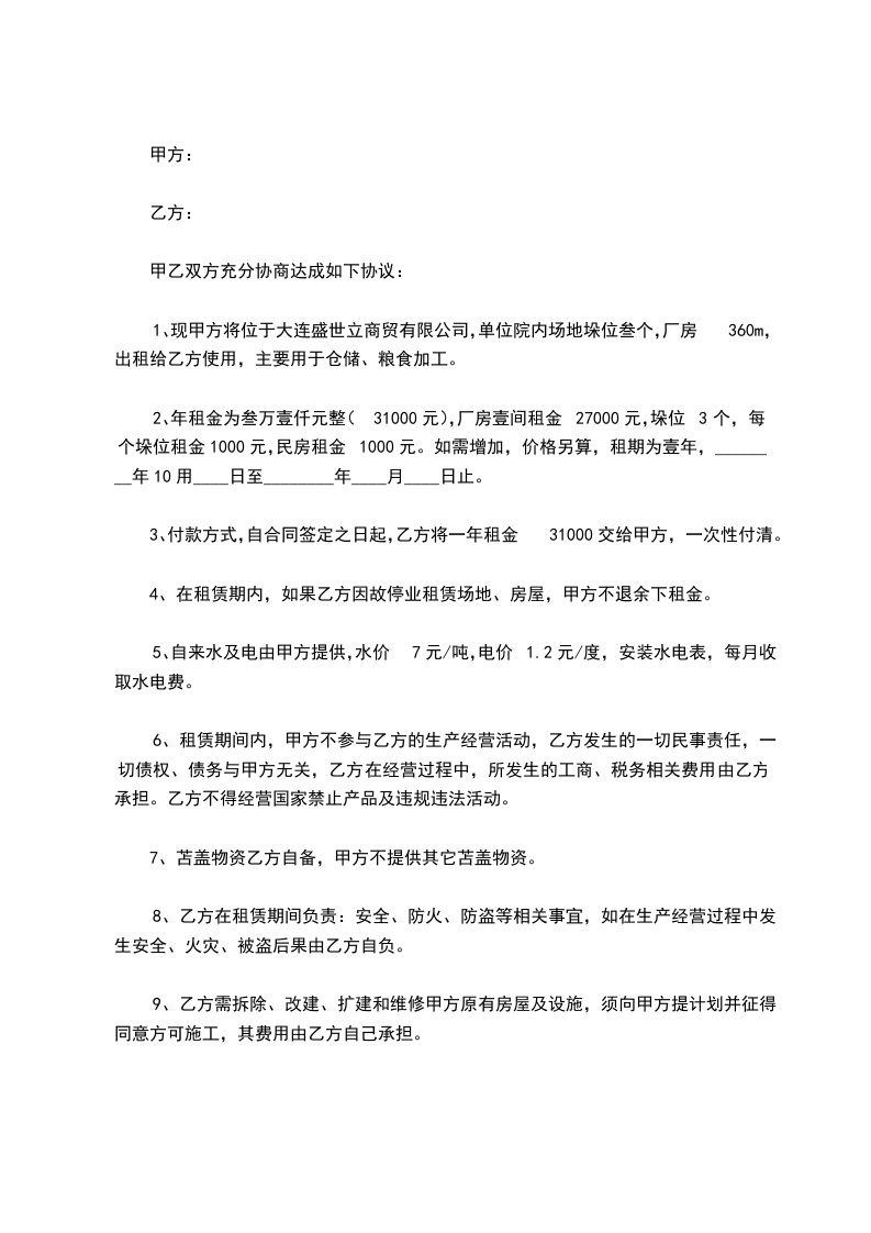2、年租金为叁万壹仟元整(31000元),厂房壹间租金27000元,垛位3个,每个垛位租金1000元,民房租金1000元。如需增加,价格另算,租期为壹年,________年10用____日至________年____月____日止。