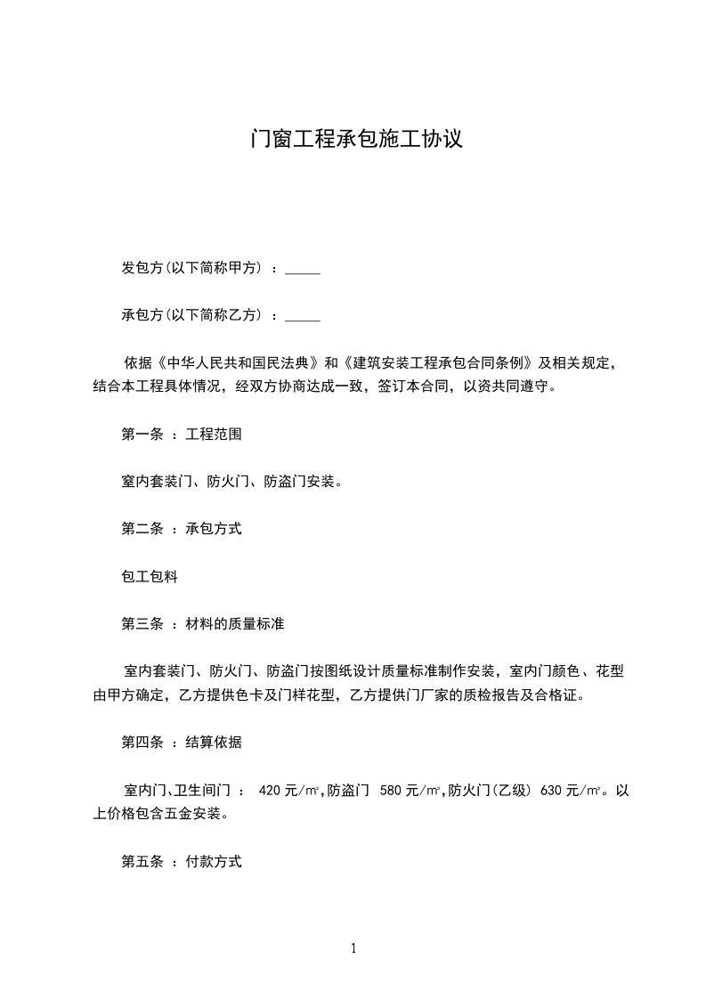 三、承包方式:_________________包工、包制作、包安装、包砂浆填缝、包安全文明施工,包竣工验收的承包方式。乙方负责协调与铝合金门窗监督和相关部门的所有工作,使本工程按照甲方规定工期通过有关部门的验收交付使用。